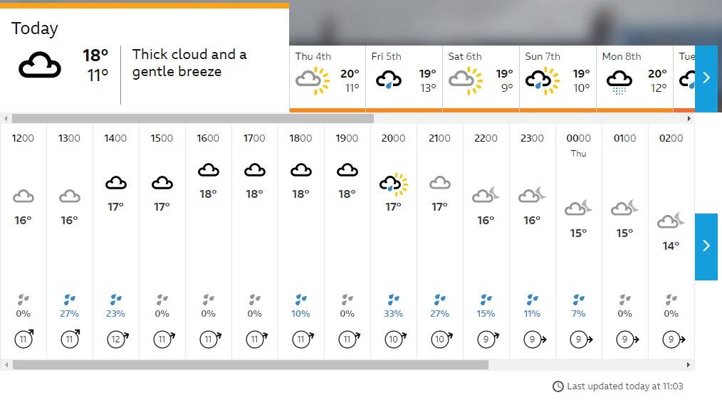 Secondo le previsioni di BBC Weather, potrebbe esserci una finestra senza precipitazioni fino alle 19 (orario inglese), con la serata che sarà ancora prevalentemente nuvolosa. La situazione, però, è in continua evoluzione.