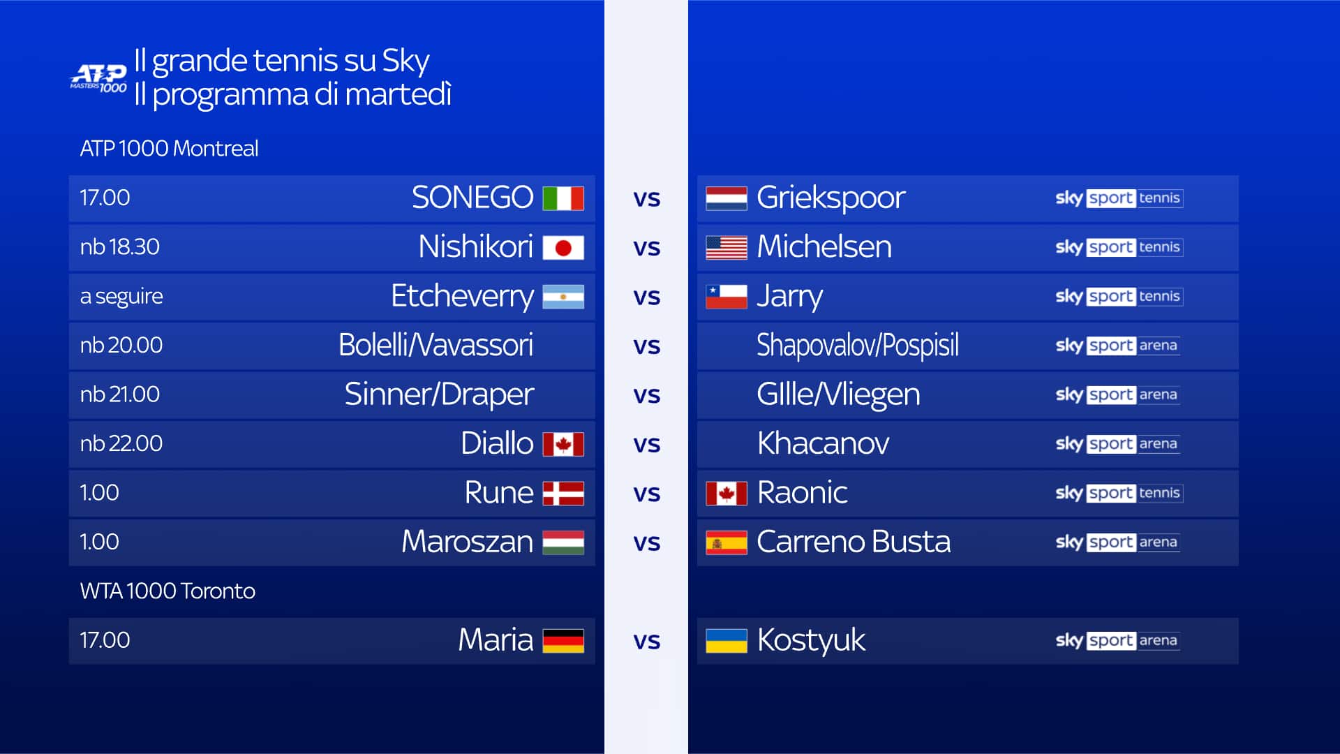 - Sky Sport Tennis e NOW: dalle 19 e dalle 24 semifinali WTA Toronto; dalle 21 e dalle 2 semifinali Masters 1000 Montreal (anche su Sky Sport Uno dalle 19.45)