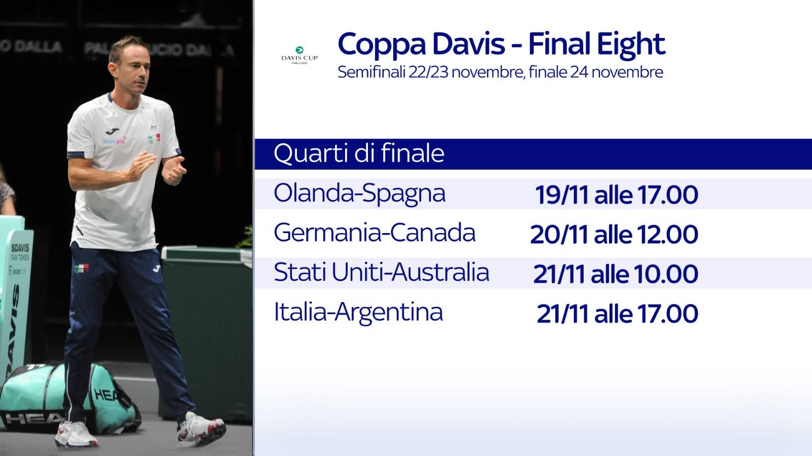 L'Italia giocherà il suo quarto di finale di Coppa Davis contro l'Argentina il prossimo 21 novembre non prima delle 17. Lo ha comunicato l'International Tennis Federation (ITF), che ha diramato il calendario della Final 8, la fase a eliminazione diretta, in programma al Palacio de Deportes José María Martín Carpena di Malaga dal 19 al 24 novembre. La squadra di capitan Filippo Volandri, a caccia del secondo trionfo consecutivo, giocherà dunque l'ultimo quarto di finale previsto. In caso di successo, gli azzurri affronteranno in semifinale una tra Australia e USA alle ore 13 di sabato 23 novembre, con la finale in programma il giorno seguente (domenica 24 alle ore 16).