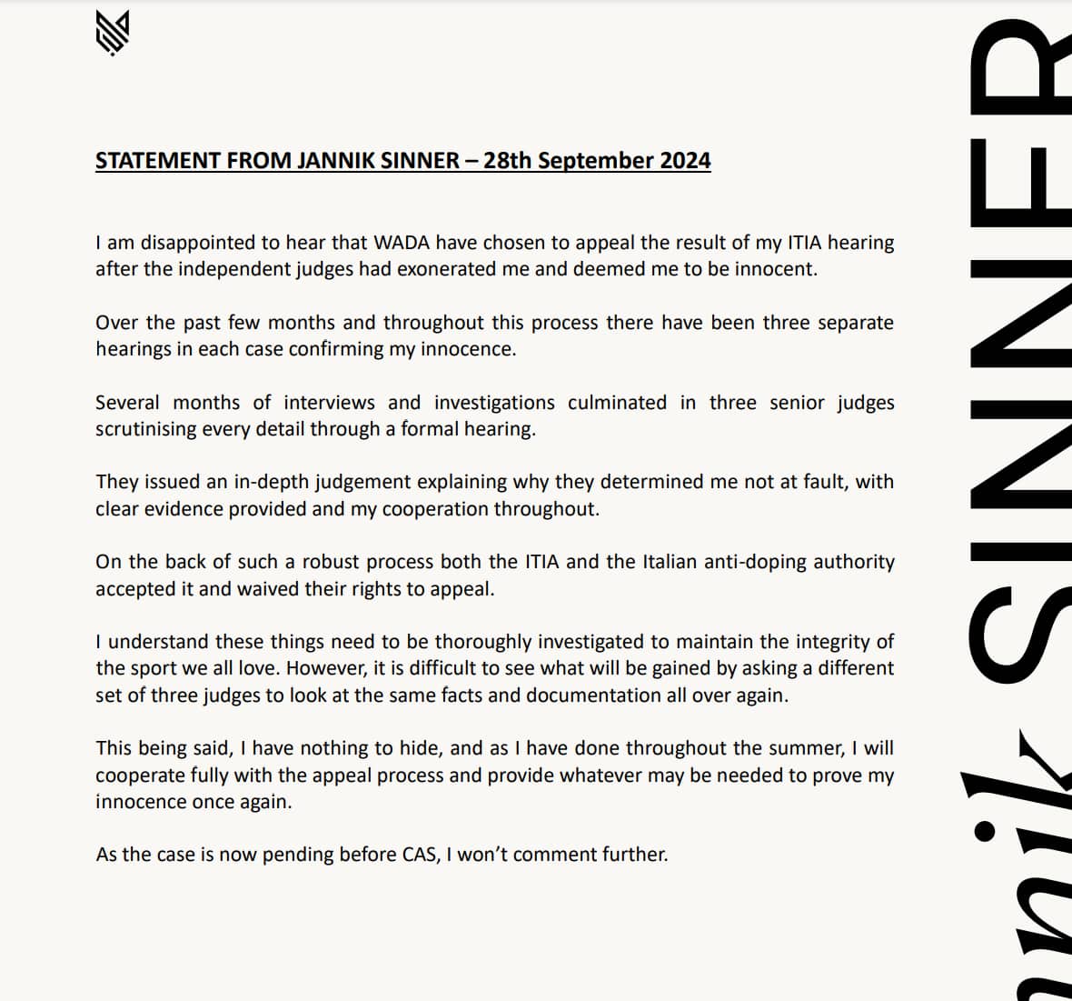 Ulteriori di dichiarazioni del tennista azzurro sono state affidate a una nota ufficiale: "Non ho nulla da nascondere e, come ho fatto per tutta l'estate, collaborerò pienamente con il processo d'appello e fornirò tutto ciò che è necessario per dimostrare la mia innocenza ancora una volta". Sinner ribadisce poi la delusione per la decisione della WADA: "Sono deluso di sapere ha scelto di appellarsi al risultato della mia udienza Itia dopo che i giudici indipendenti mi avevano scagionato e ritenuto innocente. Negli ultimi mesi e nel corso di questo processo ci sono state tre distinte udienze che hanno confermato la mia innocenza. Diversi mesi di audizioni e indagini sono culminati con tre giudici di alto livello che hanno esaminato ogni dettaglio in un'udienza formale. Hanno emesso una sentenza approfondita che spiega perché mi hanno ritenuto non colpevole, con prove chiare e la mia collaborazione".