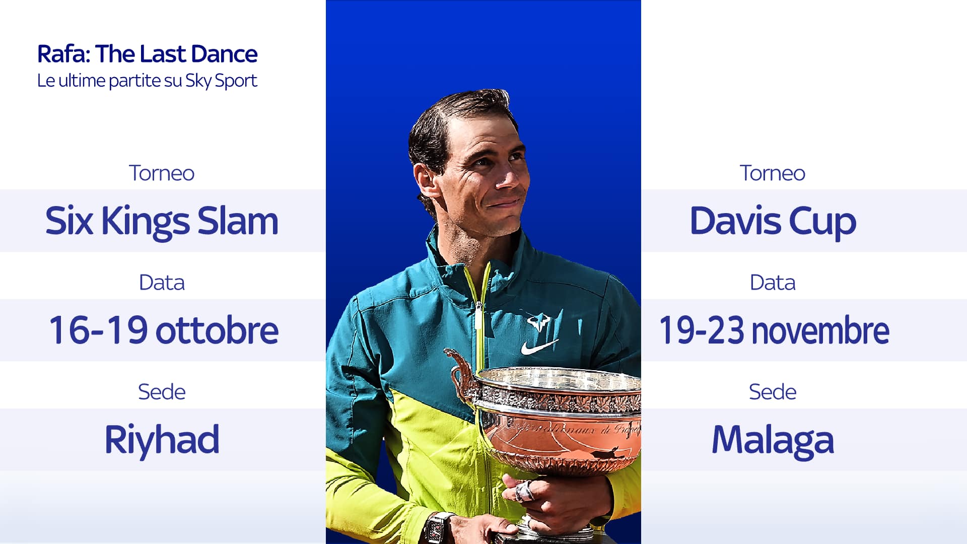 Sky ha acquisito i diritti per la trasmissione del prestigioso torneo Six Kings Slam 2024, che si terrà a Riyadh, in Arabia Saudita, da mercoledì 16 a sabato 19 ottobre. Il grande evento mondiale sarà visibile in tutti i Paesi del Gruppo Sky – Italia, Regno Unito, Irlanda, Germania, Austria e Svizzera – e vedrà la partecipazione delle più grandi star del tennis, i “Sei Re” Jannik Sinner, Novak Djokovic, Carlos Alcaraz, Daniil Medvedev, Holger Rune e Rafael Nadal, vincitore di 22 titoli Slam, in una delle sue ultime apparizioni prima del ritiro dall’attività agonistica. Il torneo-esibizione a eliminazione diretta prevede un montepremi di lusso: circa 1.5 milioni di euro per la partecipazione di ognuno dei sei tennisti, mentre al vincitore andranno quasi 4.5 milioni di euro.