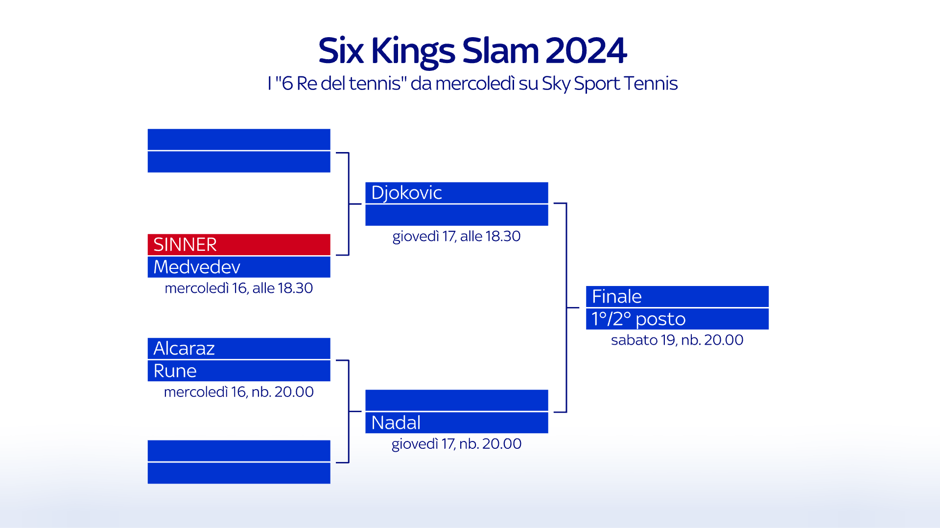 In Italia, il grande evento sarà trasmesso su Sky e in streaming su NOW, sul canale dedicato, Sky Sport Tennis (203), sempre acceso e una copertura di altissimo livello, editoriale e tecnologico. Torna il racconto attento della super squadra di giornalisti e talent, con studi live sempre più all’avanguardia. Ampia copertura anche su Sky Sport 24 e sulle piattaforme digital e social di Sky Sport. Sul sito skysport.it ampia copertura del torneo con gli highlights di tutti i match coperti dalla tv, oltre al live blog di tutte le partite di Sinner e della finale.