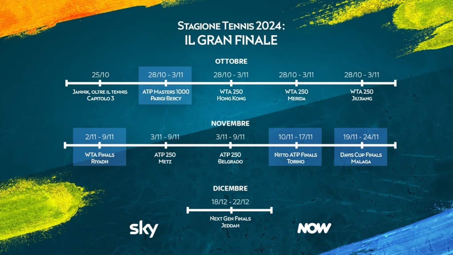 Sta per partire il Gran Finale di una stagione di tennis straordinaria, che regalerà ancora tanto spettacolo e divertimento nella Casa dello Sport di Sky. Dopo 10 mesi di sfide appassionanti, in arrivo oltre 600 ore di appuntamenti live da vivere su Sky e in streaming su NOW, con ben 10 tornei in 60 giorni. Tra questi, quattro grandi eventi che vedranno in campo tantissima Italia: si parte già lunedì 28 ottobre dal Masters 1000 di Parigi-Bercy in esclusiva su Sky, di scena fino al 3 novembre, per poi tornare a Torino dal 10 al 17 novembre per le Nitto Atp Finals, dove Jannik Sinner proverà a legittimare il ruolo di numero uno del mondo. Da non perdere anche la tappa di Riyadh con le Wta Finals, di scena dal 2 al 9 novembre: Jasmine Paolini scende in campo per giocarsi il titolo del torneo singolare e, insieme a Sara Errani, anche nel doppio, per provare a bissare il trionfo olimpico di Parigi. E ancora, l’appuntamento a Malaga con le Davis Cup Finals, dal 19 al 24 novembre, dove l’Italia di Volandri inseguirà il bis.