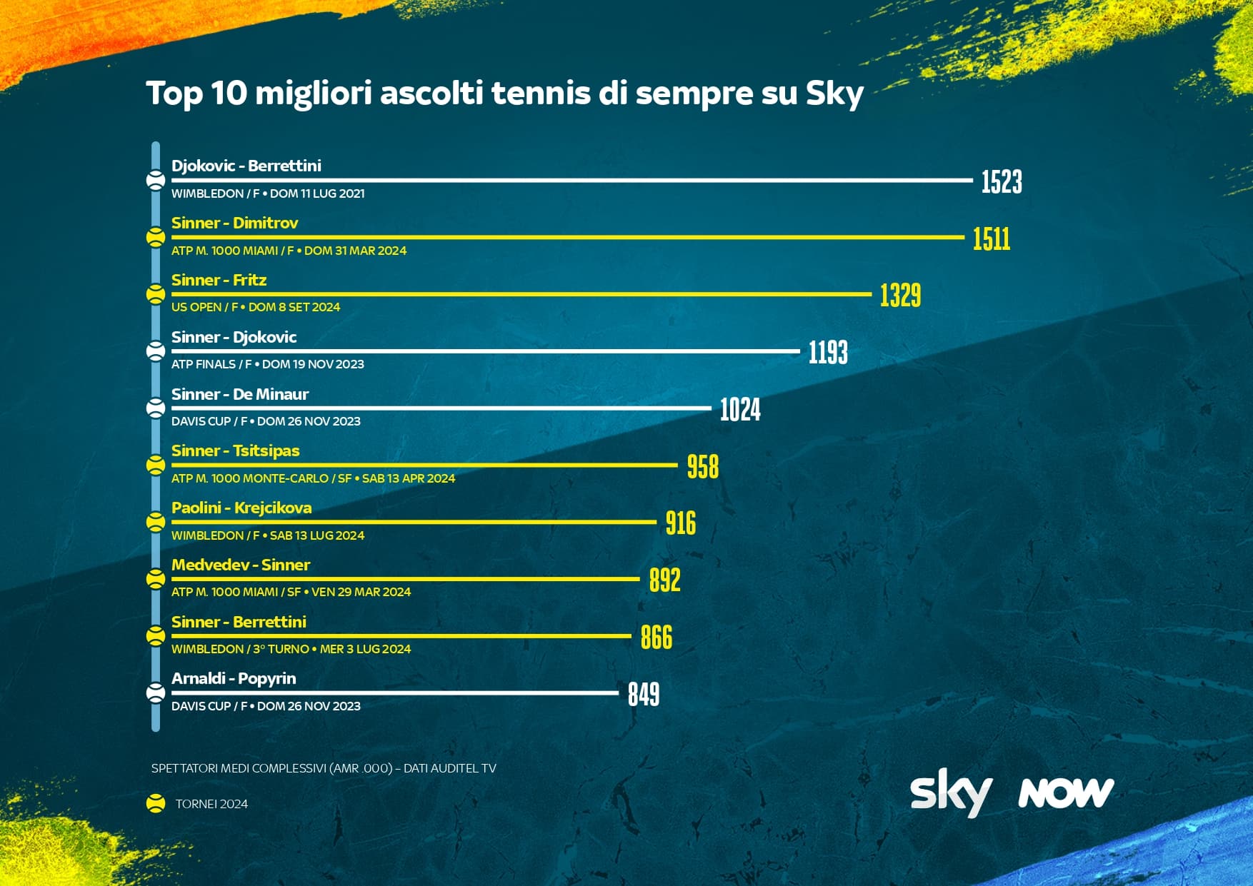 Sta per terminare una stagione da record per il tennis su Sky, tra i pilastri dell’offerta della Casa dello Sport: nel corso del 2024, il tennis ha infatti catalizzato il 22% degli ascolti complessivi di Sky Sport, mettendo a segno una crescita del 121% rispetto all’anno precedente. Ben 6 i match di quest’anno che rientrano nella top 10 dei migliori ascolti di sempre. Tra questi, la finale del Masters 1000 di Miami tra Jannik Sinner e Grigor Dimitrov, con 1 milione e 511 mila spettatori medi, e la finale degli US Open tra Jannik Sinner e Taylor Fritz, con 1 milione 329 mila spettatori medi, rispettivamente il secondo e il terzo evento tennistico più visti di sempre su Sky. Da segnalare anche la finale del Masters 1000 di Shanghai tra Jannik Sinner e Novak Djokovic, seconda migliore gara di tennis di sempre su Sky per share tv (11%), dopo la finale di Wimbledon 2021 Djokovic-Berrettini. La miglior partita femminile di sempre è stata invece la finale di Wimbledon tra Barbora Krejcikova e Jasmine Paolini, che ha ottenuto 916 mila spettatori con il 9,7% di share tv e quasi 1,7 milioni di contatti unici.