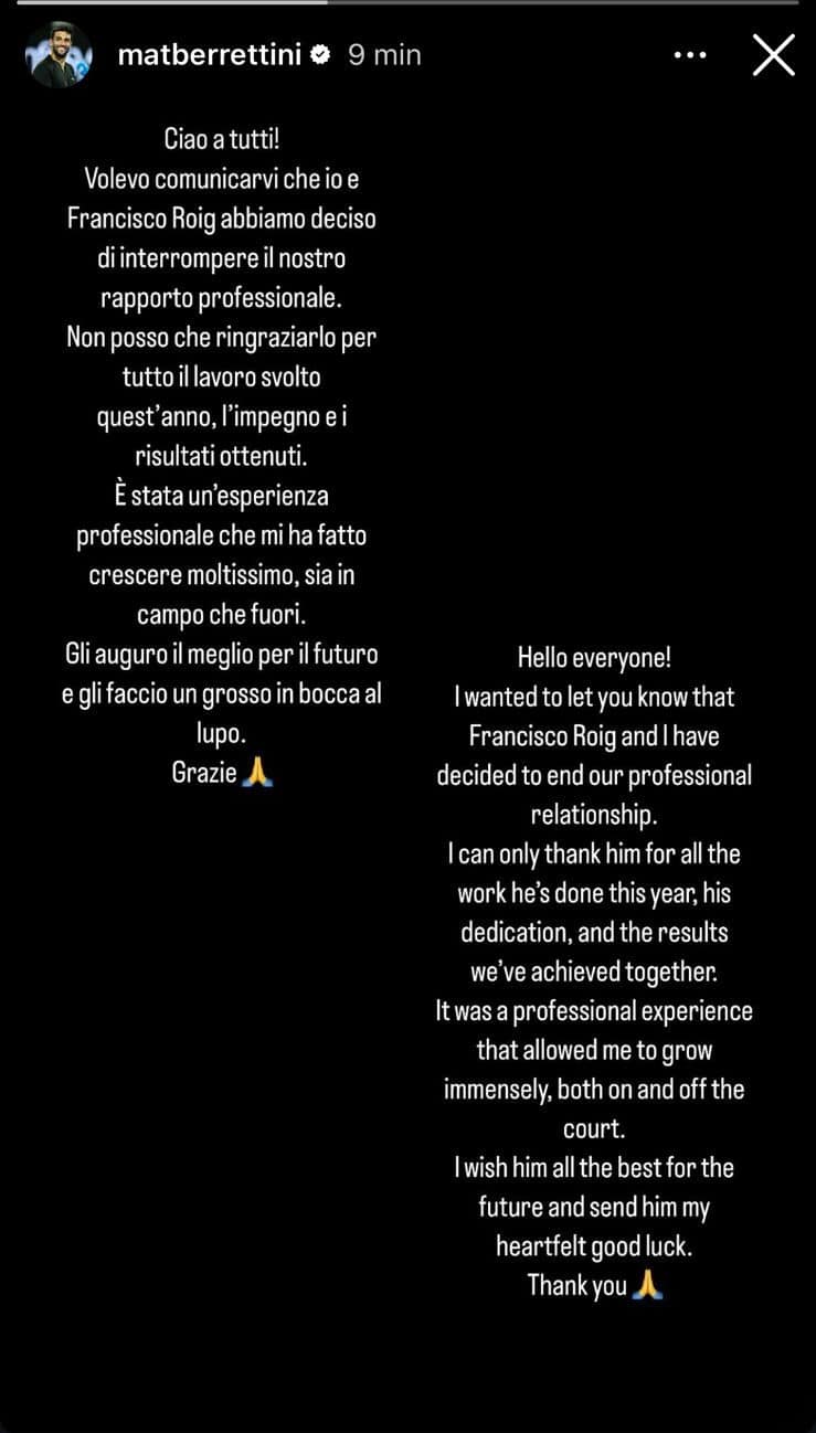 Dopo meno di un anno Matteo Berrettini si separa dal coach spagnolo Francisco Roig. L'annuncio del romano su Instagram: "È stata un'esperienza professionale che mi ha fatto crescere moltissimo, sia in campo che fuori"