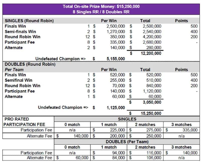 - Ogni vittoria round robin: 350 mila $