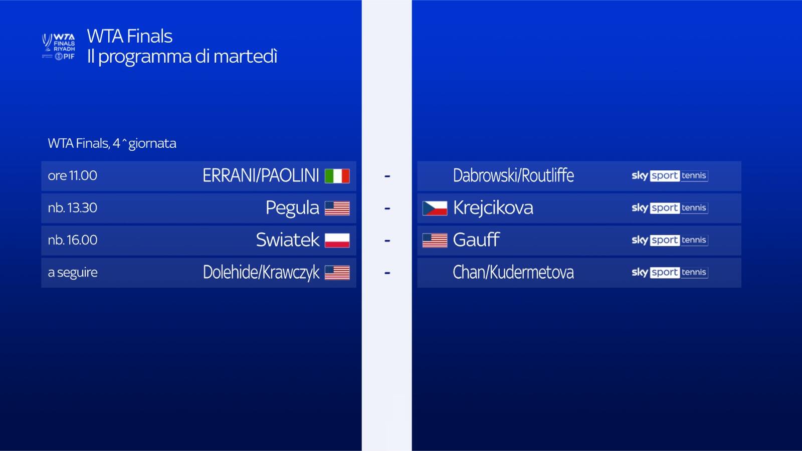 Su Sky e NOW sarà possibile seguire tutti i match del torneo di singolare e di doppio in diretta, con il racconto della squadra tennis. Oltre a proporre tutte le sfide, Sky Sport seguirà le WTA Finals 2024 con studi di presentazione e approfondimento su Sky Sport 24, condotti da Eleonora Cottarelli. L’inviato Stefano Meloccaro curerà i collegamenti in diretta da Riyadh. Ampia copertura anche sulle piattaforme digital e social di Sky Sport. In particolare, sul sito skysport.it saranno disponibili gli highlights dei match, oltre al liveblog di tutte le partite di Paolini e della finale.