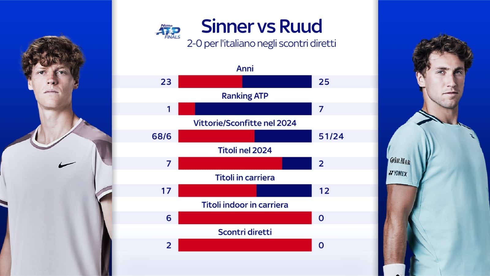 atp finalsJannik Sinner affronta sabato alle 20.30 Casper Ruud nella semifinale delle Atp Finals 2024: alla Inalpi Arena, il match è in diretta su Sky Sport Uno, Sky Sport Tennis e in streaming su NOW