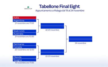 - L'Italia di Sinner e la Spagna di Nadal e Alcaraz avranno un cammino parallelo e potrebbero incontrarsi soltanto in finale, in programma domenica dalle 16. Da molti è già stata definita la finale dei sogni che vedrebbe per la prima volta Sinner e Alcaraz di fronte con le maglie dei propri Paesi. Prima, però, ci sono due tie da superare tutt'altro che semplici;