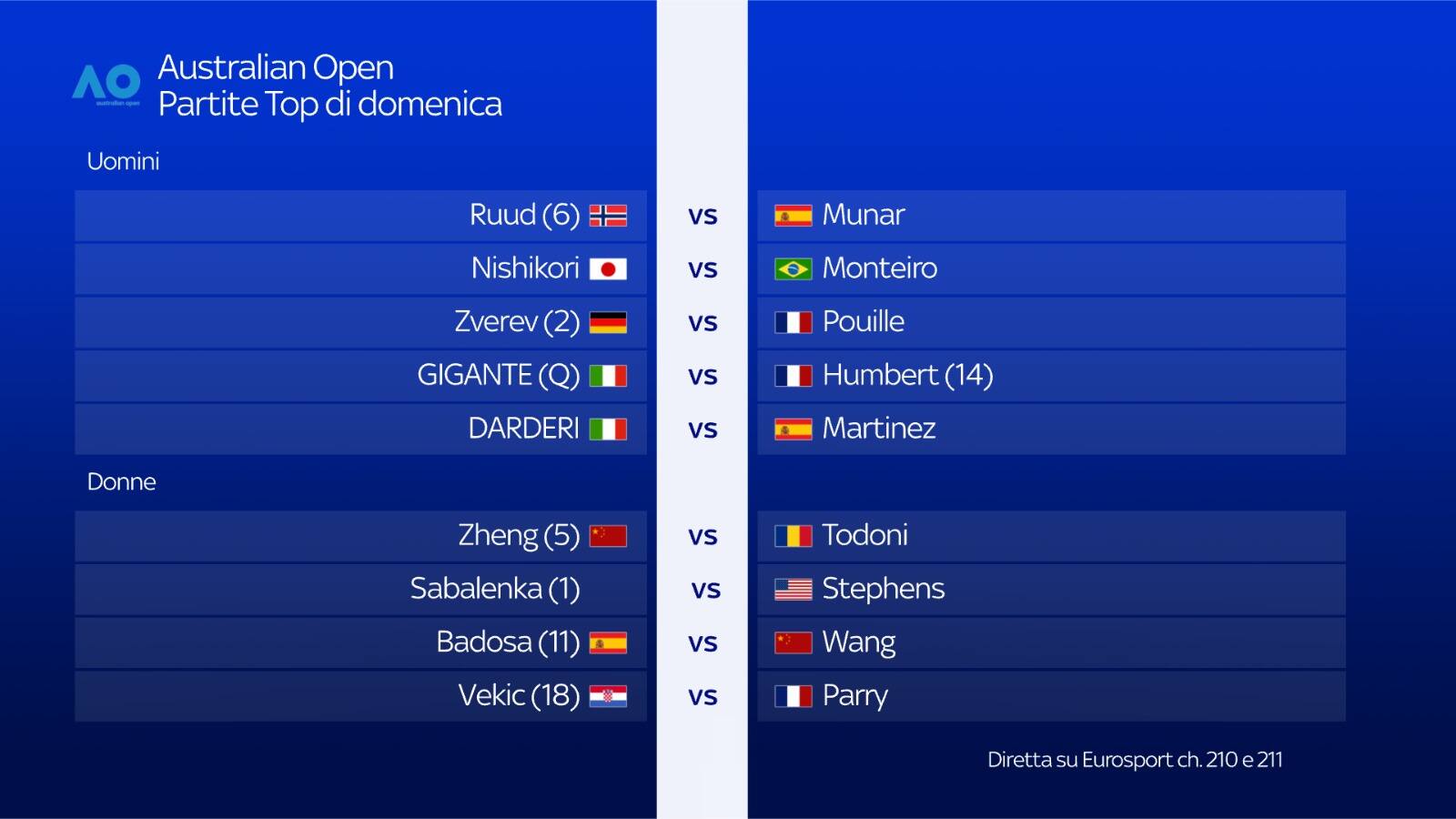 aus openAl via domenica 12 gennaio gli Australian Open, con in campo subito due azzurri: Darderi sfida Martinez, Gigante se la vedrà con Humbert, 14 del seeding. Tocca anche a Zverev, 2^ testa di serie del tabellone e Sabalenka, campionessa in carica del torneo femminile. Il torneo in diretta su Eurosport, canali 210 e 211 del telecomando Sky e in streaming su NOW