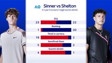 - Shelton e Sinner si sono affrontati cinque volte in carriera: il bilancio è 4-1 per Jannik. Teatro del primo e dell'ultimo precedente è stato il Masters 1000 di Shanghai. Nel 2023 vinse Shelton (Sinner pagò anche la stanchezza accumulata a Pechino), un anno dopo l'azzurro.