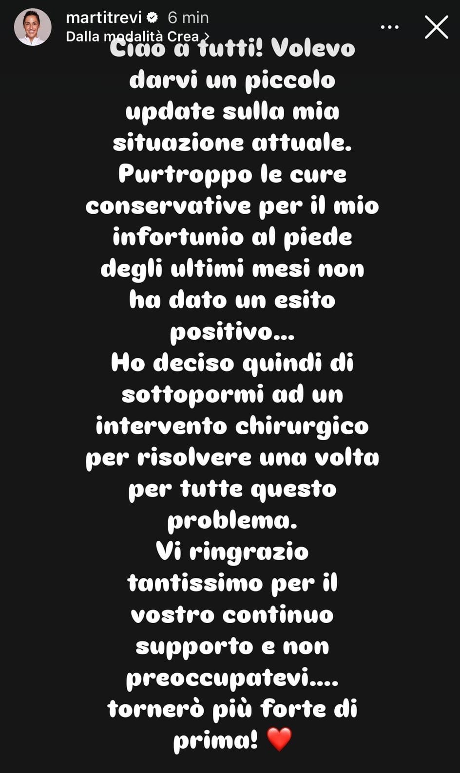 La semifinalista del Roland Garros 2022, ex n. 18 al mondo, ha annunciato un intervento al piede: "Le terapie conservative non hanno dato esito positivo, ho deciso di sottopormi a un intervento chirurgico per risolvere il problema. Tornerò più forte di prima"