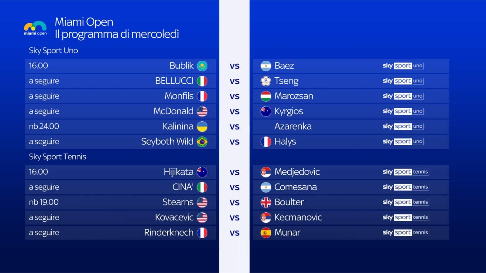 guida tvSi apre oggi il Masters di Miami, secondo 1000 stagionale. Subito in campo due azzurri, tra i più attesi: il 17enne Federico Cinà, all'esordio assoluto nel circuito grazie a una wild-card, affronta l'argentino Comesana. Mattia Bellucci se la vedrà con Tseng Chun-hsin. Il torneo in diretta su Sky Sport e in streaming su NOW