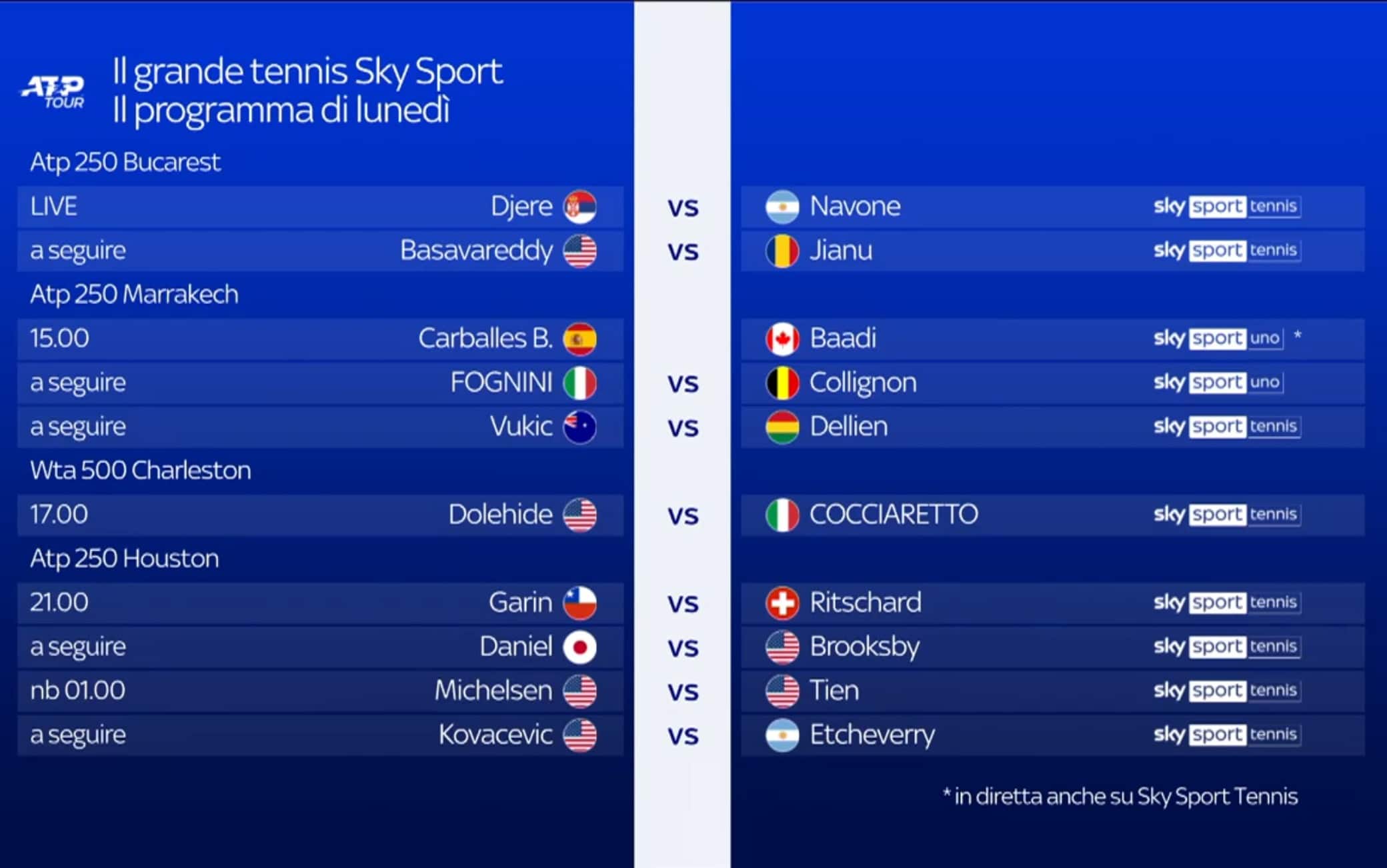 - Sky Sport Tennis dalle 13 finale ATP Bucarest; dalle 16 finale ATP Marrakech; dalle 21 ATP Houston