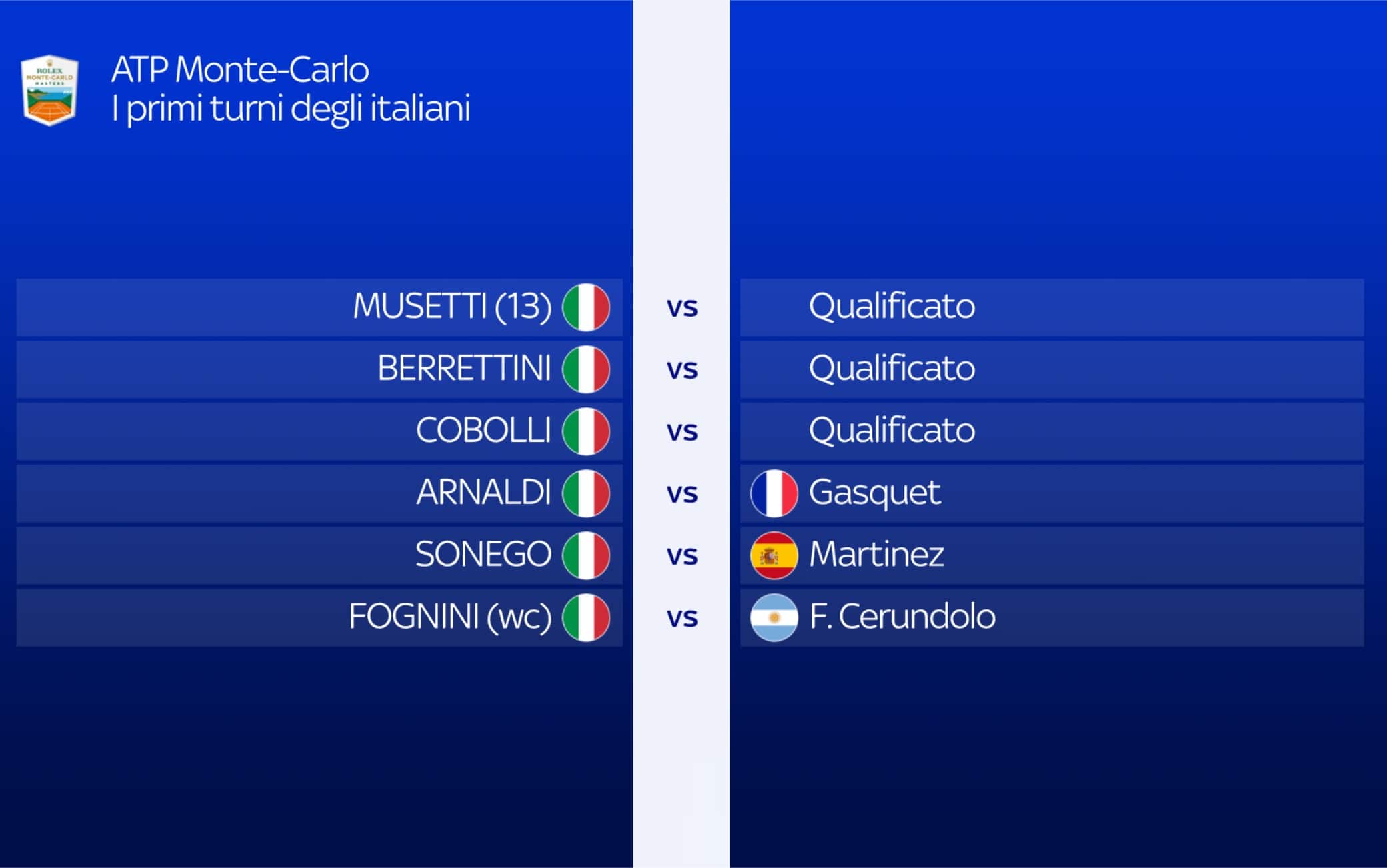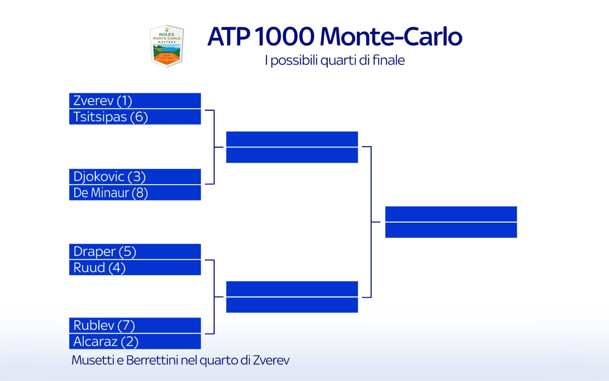 Inizierà con dei qualificati il cammino di Lorenzo Musetti e Matteo Berrettini al Masters 1000 di Monte-Carlo. Punte della pattuglia azzurra nel primo 1000 su terra rossa della stagione, il carrarino e il romano sono stati inseriti nella parte alta del tabellone, esattamente nel quarto del n. 1 del seeding, Sascha Zverev. Berrettini potrebbe incrociare il tedesco già al 2° turno, mentre agli ottavi potrebbe esserci o un suggestivo derby italiano o la sfida Zverev-Musetti (per Lorenzo 2° turno con Lehecka o Korda). Tra le altre sfide suggestive riflettori puntati su Fabio Fognini. In tabellone grazie a una wild card, il campione di Monte-Carlo 2019 esordirà con Francisco Cerundolo e, in caso di vittoria, troverebbe al 2° turno Carlos Alcaraz, al ritorno a Roquebrune tre anni dopo la prima e unica partecipazione. Parte alta di tabellone, infine, per Novak Djokovic che entrerà in gioco contro Wawrinka o Tabilo.