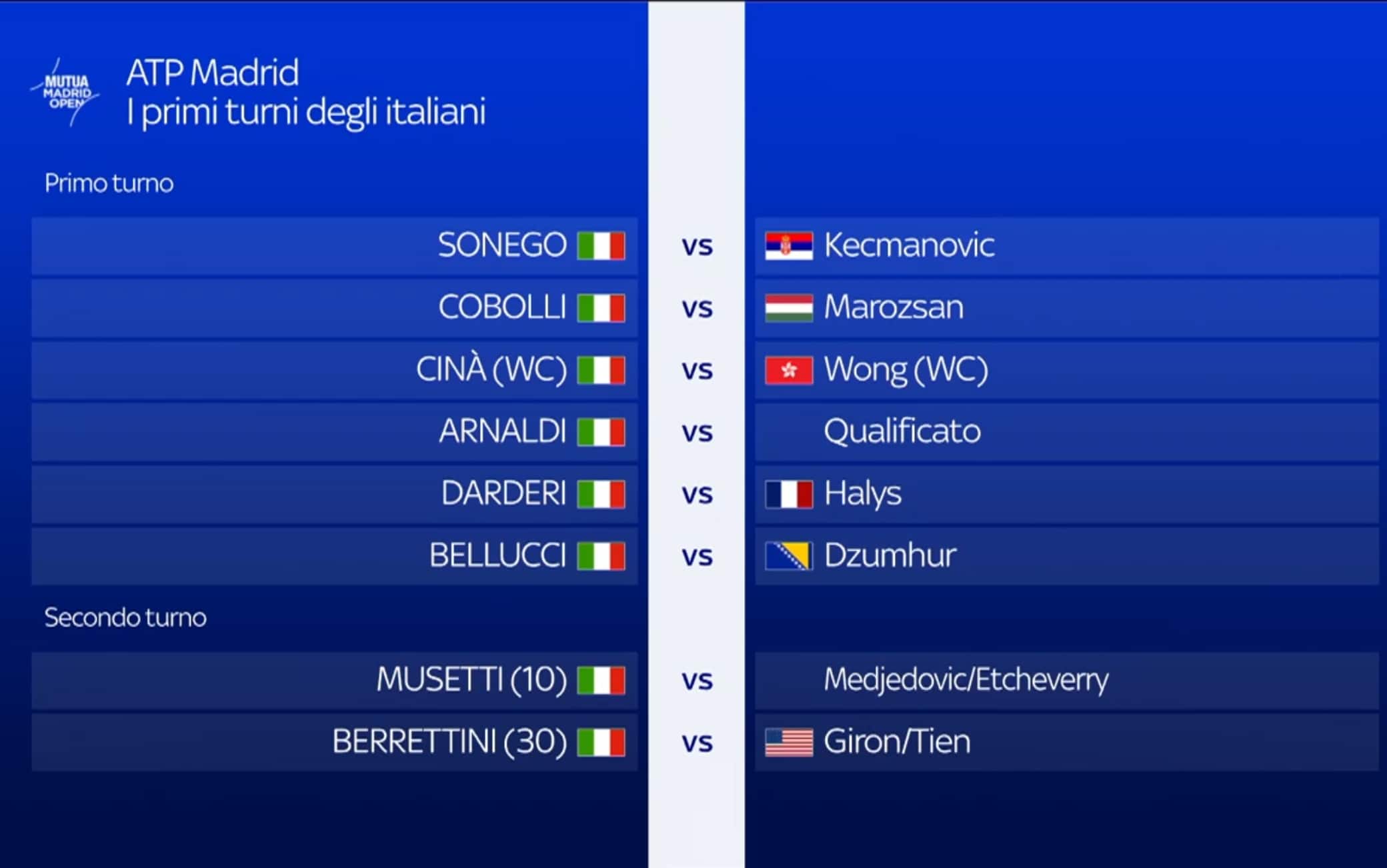 Dopo gli Atp 500 di Barcellona e di Monaco di Baviera, il tennis fa tappa a Madrid per il secondo Masters 1000 stagionale sulla terra battuta, in programma dal 23 aprile al 4 maggio e in diretta su Sky Sport e in streaming su NOW. Comincerà al secondo turno il percorso di Lorenzo Musetti. L'azzurro, n. 11 del ranking e testa di serie numero 10, torna in campo dopo la finale persa a Monte-Carlo contro Carlos Alcaraz e affronterà il vincitore della sfida tra Medjedovic ed Etcheverry (con potenziale ottavo di finale contro De Minaur). Al secondo turno inizierà anche il torneo di Matteo Berrettini, che attende uno tra Tien e Giron (con ipotesi di terzo turno contro Jack Draper). Presenti in tabellone altri sei italiani: Cobolli sfiderà l'ungherese Marozsan (reduce dalla semifinale di Monaco di Baviera), mentre Darderi il francese Halys. Sonego se la vedrà contro Kecmanovic, mentre Bellucci andrà contro il bosniaco Dzumhur. Matteo Arnaldi attende un qualificato, con un possibile secondo turno contro Djokovic. Infine, presente anche come wild card l'azzurro Federico Cinà, che al primo turno giocherà contro un'altra wild card, Wong.