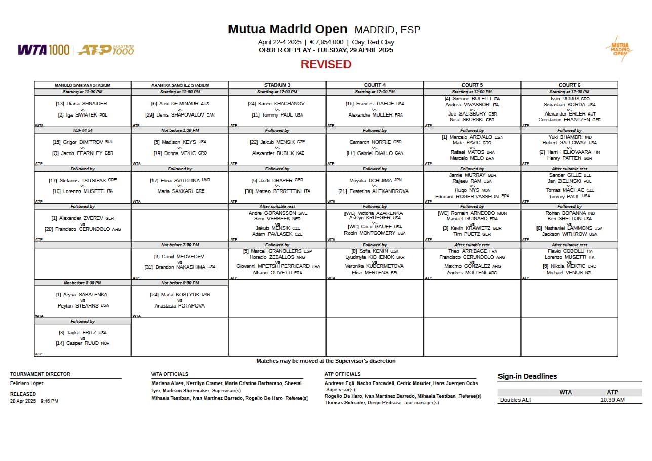 Gli organizzatori hanno diramato il nuovo programma di gioco per martedì 29 aprile, che prenderà il via alle 12 con un'ora di ritardo rispetto al consueto. Sarà un concentrato di partite distribuite su sei campi, che vedrà in campo anche i due italiani che non sono riusciti a giocare. Lorenzo Musetti affronterà Stefanos Tsitsipas come 3° match dalle 12 sul Centrale, Matteo Berrettini invece se la vedrà con Jack Draper come 3° match dalle 12 sul Court 3. In campo tutti i match rinviati lunedì, compreso Dimitrov-Fearnley (sospesa sul 6-4, 5-4), con l'aggiunta dei primi quattro ottavi di finale già definiti: Zverev-Cerundolo, Menisk-Bublik, Fritz-Ruud e Medvedev-Nakashima.