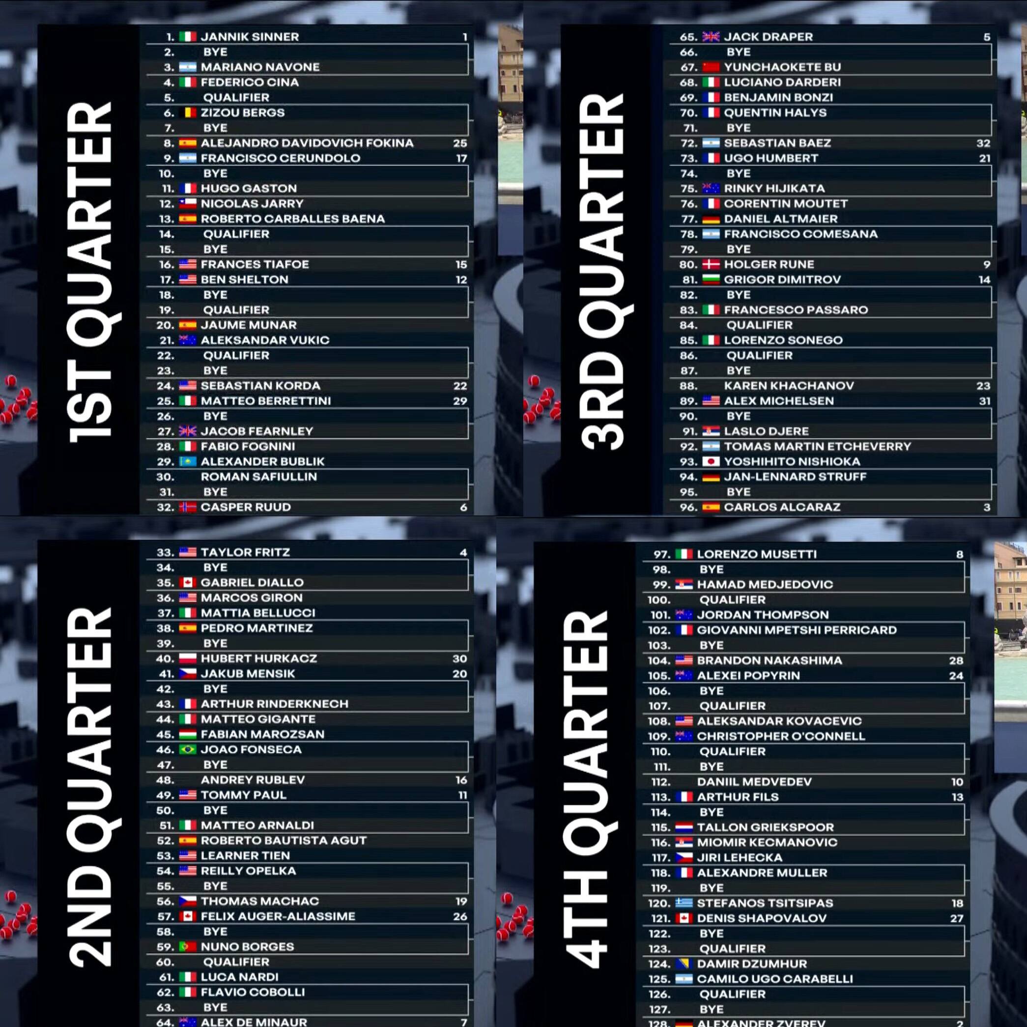 Gli Internazionali d'Italia entrano nel vivo con il sorteggio che è stato effettuato oggi a Roma. Al Foro Italico attesa spasmodica per il ritorno di Jannik Sinner dopo i 3 mesi di stop per il caso clostebol: la testa di serie n°1 del seeding, dopo il bye del 1° turno, se la vedrà con il vincente di Navone-Cinà ed è nella parte di tabellone occupata da Taylor Fritz: evitato dunque Carlos Alcaraz sino alla eventuale finale. Sono ben 13 gli italiani al via del Masters 1000 di Roma, in attesa delle qualificazioni. Il torneo in diretta su Sky Sport e in streaming su NOW dal 7 al 18 maggio.
