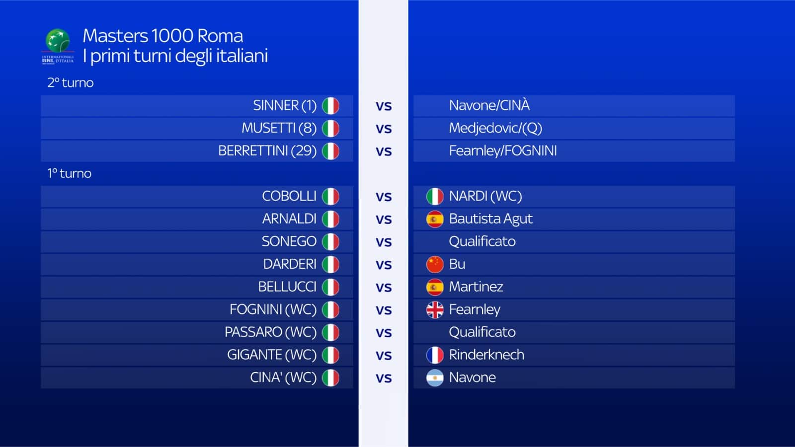 internazionaliSorteggiato il tabellone maschile degli Internazionali d'Italia. La testa di serie n°1 Jannik Sinner nella parte alta insieme a Fritz (evitato Alcaraz), possibili quarti con Ruud o Berrettini: al 2° turno possibile derby con Cinà. Musetti finisce dalla parte di Zverev. Il torneo in diretta su Sky Sport e in streaming su NOW dal 7 al 18 maggio