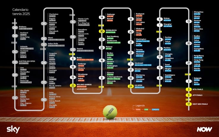 In arrivo su Sky più di 90 competizioni di ogni tipo per oltre 6.000 ore di diretta. Tennis grande protagonista a partire dagli Internazionali BNL d’Italia al via da oggi a Roma: 13 giorni di sfide sui campi del Foro Italico, con tutte le partite in diretta e l’atteso ritorno di Jannik Sinner. Un grande appuntamento che precede Wimbledon, in esclusiva, e gli US Open in estate, oltre a una serie di ben 42 tornei, tutti da vivere su Sky.