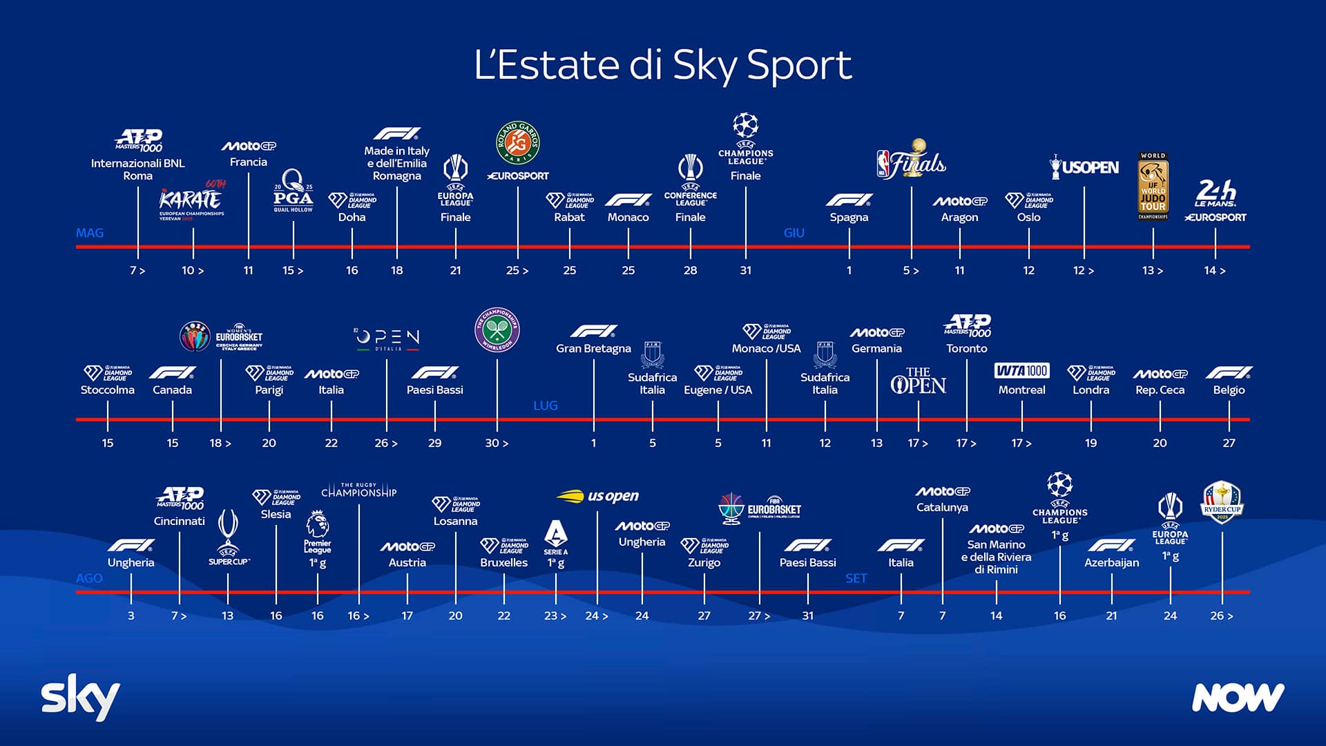 Ed è solo l’inizio di una caldissima estate di sport su Sky: proseguono i brividi dei motori, tra i protagonisti assoluti dell’estate grazie ai 21 Gran Premi di Formula 1 e MotoGP (oltre a tutti i Round di Superbike e molto altro ancora), con tante tappe italiane tra Imola, Mugello, Monza e Misano. Anche il basket in primo piano: si assegnano i titoli in Turkish Airlines Euroleague e NBA, mentre si avvicinano l’Europeo femminile (18-29 giugno) e quello maschile (27 agosto-14 settembre). Per il rugby è il momento degli incontri internazionali, con la doppia sfida Sudafrica-Italia a luglio e tanti spettacolari test match. Poi i meeting di atletica leggera più appassionanti, fino alle finali di Diamond League a Zurigo a fine agosto, il volley con le Final Four di Champions League maschile dal 16 al 18 maggio in Polonia, oltre ai tornei di golf più leggendari, dal PGA Championship allo US Open, dall’Open d’Italia al The Open Championship, per arrivare alla Ryder Cup in programma a settembre. Nella Casa dello Sport sarà possibile assistere anche allo spettacolo del karate, con gli Europei di scena il 10 e l’11 maggio, dei Mondiali di judo (13-20 giugno), dei tornei del Premier Padel, del baseball MLB e tanto altro ancora.