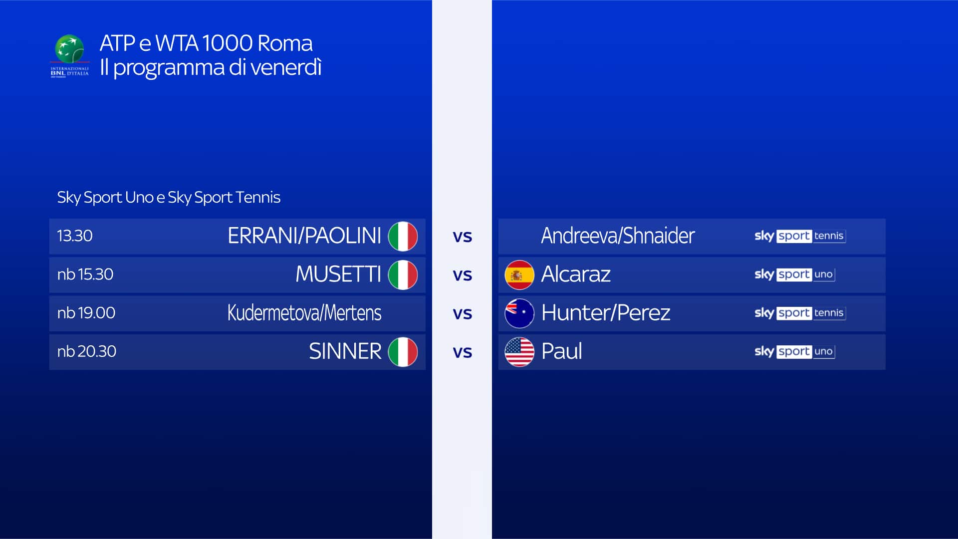 Il venerdì storico del tennis azzurro sarà tutto da vivere su Sky e in streaming su NOW: si parte alle 13.30 con il doppio Errani/Paolini-Andreeva/Shnaider su Sky Sport Tennis e NOW. Alle 15.30 sarà il turno della prima semifinale maschile Musetti-Alcaraz, su Sky Sport Uno, Sky Sport Tennis e NOW, mentre in serata - non prima delle 20.30 – stessi canali per la seconda semifinale Sinner-Paul. Domani, sabato 17 maggio, appuntamento con la storia, con la finale WTA tra Paolini e Gauff in programma alle 17 su Sky Sport Tennis e NOW.