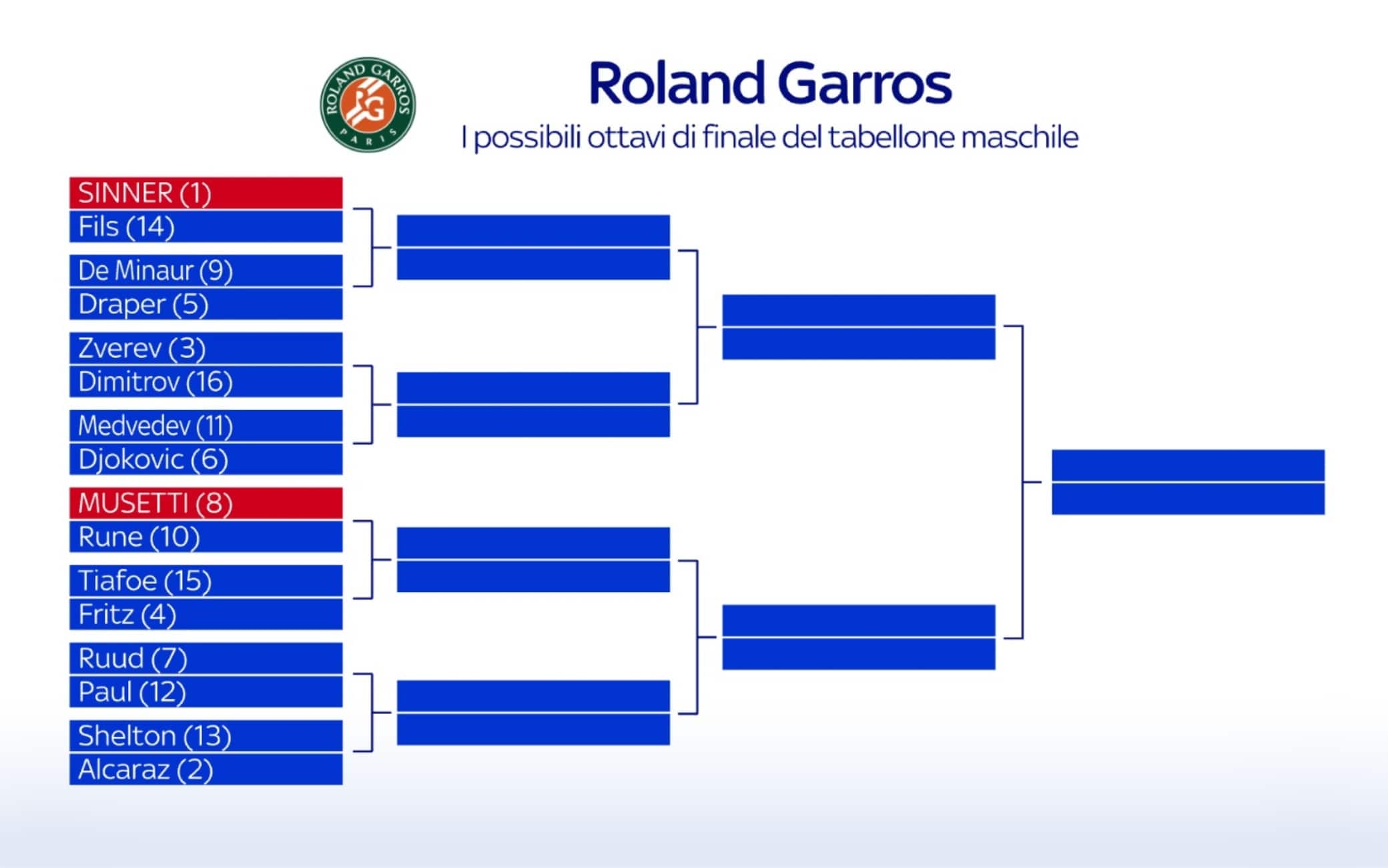 Roland Garros, il tabellone: Sinner nella parte alta con Zverev e Djokovic
