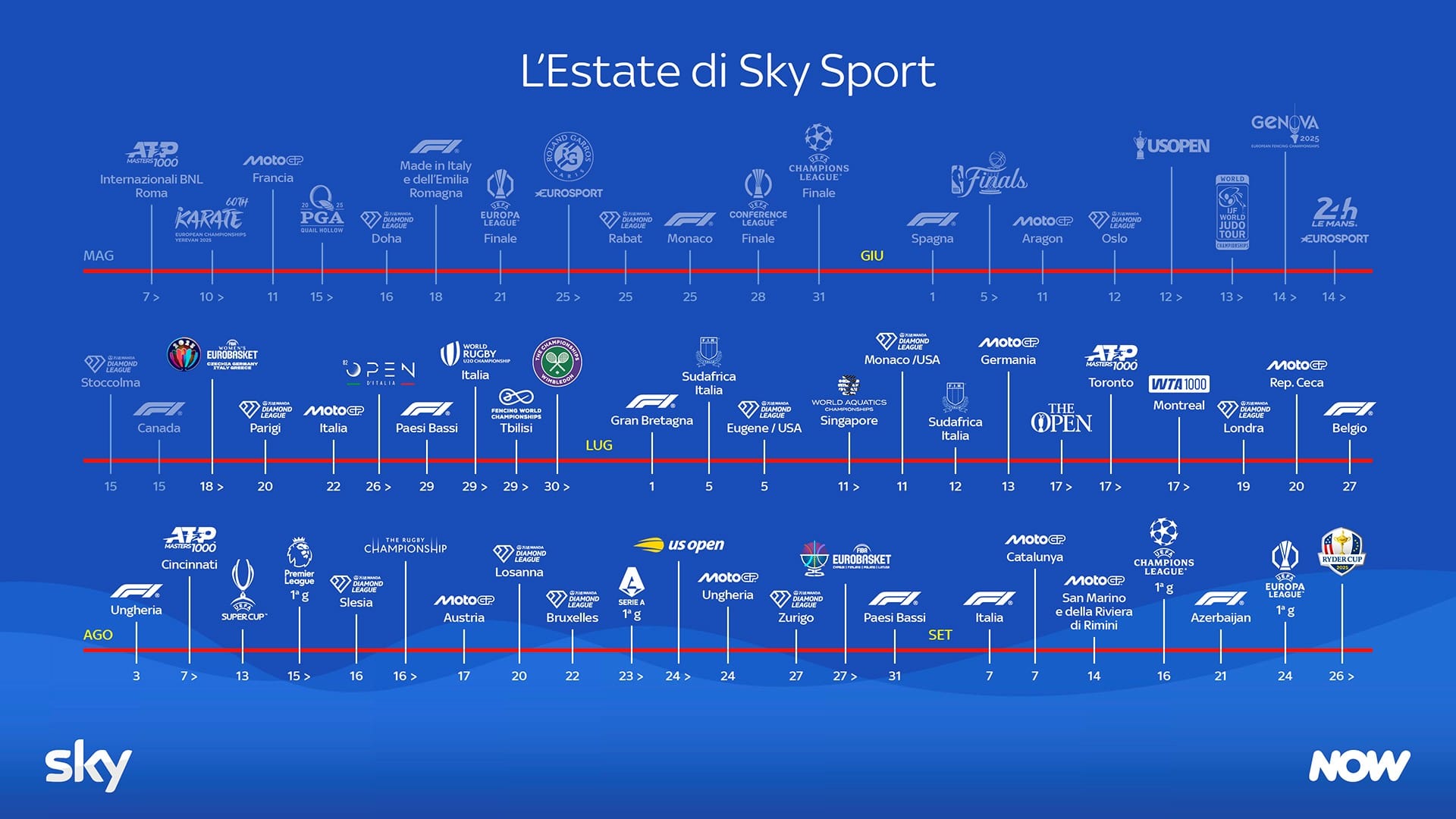 E ancora, nella grande estate 2025 di Sky Sport, in arrivo altri eventi internazionali da non perdere: la 22esima edizione dei World Aquatics Championships, i Campionati del mondo delle discipline acquatiche di scena a Singapore dall’11 luglio al 3 agosto; la 70esima edizione dei FIE World Championships, i Campionati del mondo di scherma a Tbilisi, in Georgia, dal 22 al 30 luglio, e il World Rugby U20 Championship, la Coppa del mondo di rugby Under 20 in programma in Italia dal 29 giugno al 19 luglio. Tra gli eventi imperdibili di questi mesi anche gli US Open di tennis (dal 24 agosto al 7 settembre), i 15 Gran Premi tra Formula 1 e MotoGP e la Ryder Cup di golf a settembre.