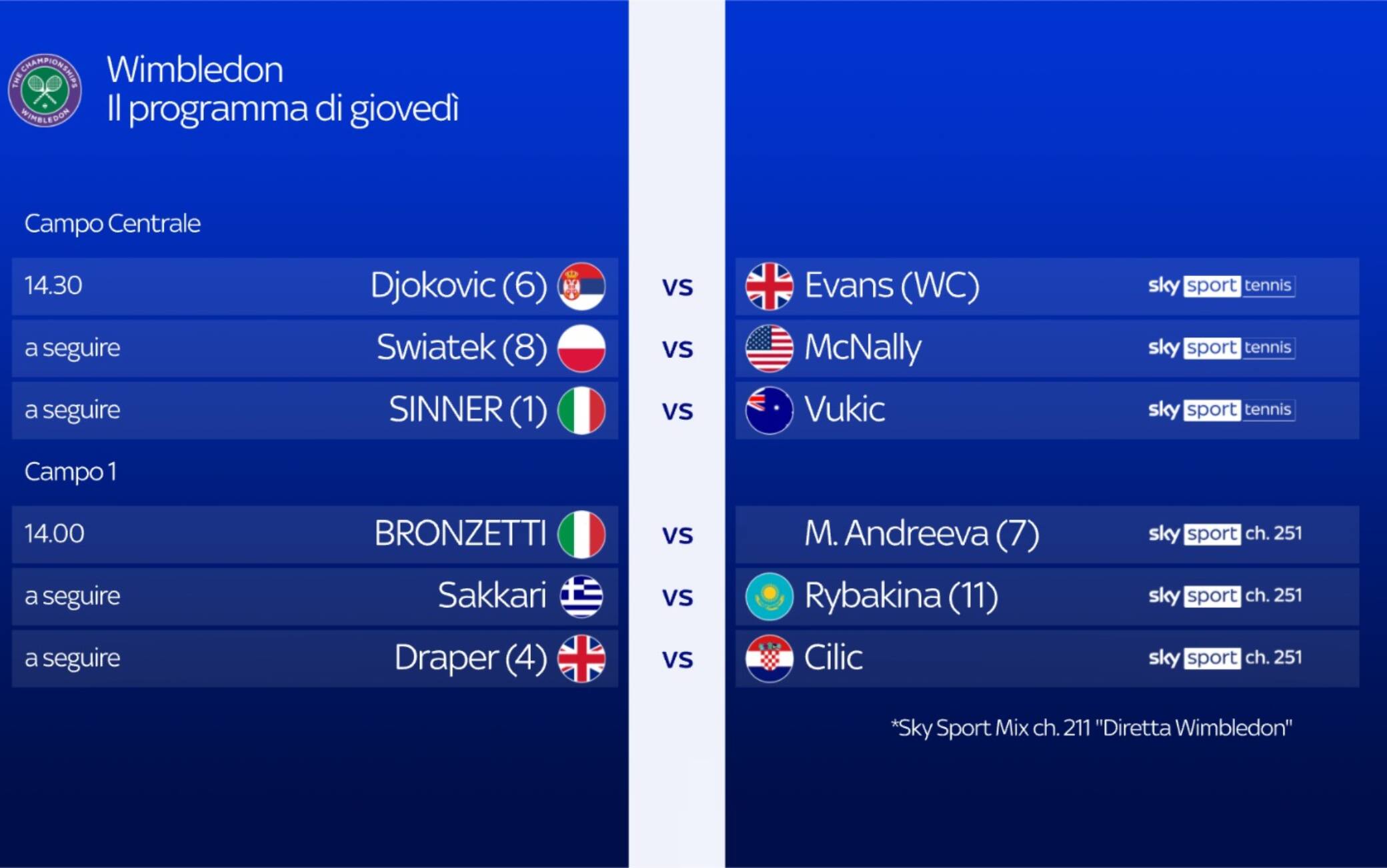 wimbledonJannik Sinner sfiderà l'australiano Aleksandar Vukic (numero 93 al mondo) al secondo turno a Wimbledon. Il match, in programma giovedì 3 luglio come terzo incontro sul Centrale dalle ore 14.30, sarà in diretta su Sky Sport Tennis e in streaming su NOW