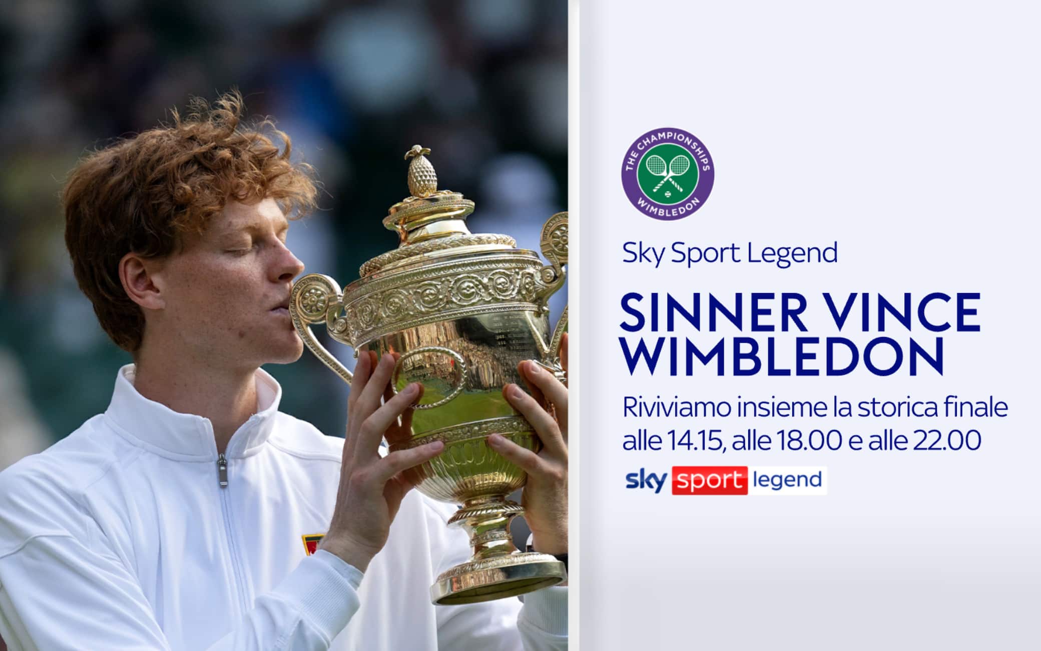 Per celebrare l'impresa da leggenda di Sinner, primo italiano a trionfare nel torneo londinese, programmazione speciale dalle 14 su Sky Sport Legend (canale 210) e in streaming su NOW. Repliche della finale alle 14.15, alle 19 e a mezzanotte seguite dal postpartita Sky Tennis Show; l'episodio conclusivo di The Insider alle 18.30 e alle 23.30. Inoltre, tutte le partite del percorso di Sinner, gli highlights e le puntate di The Insider sono disponibili on demand.
