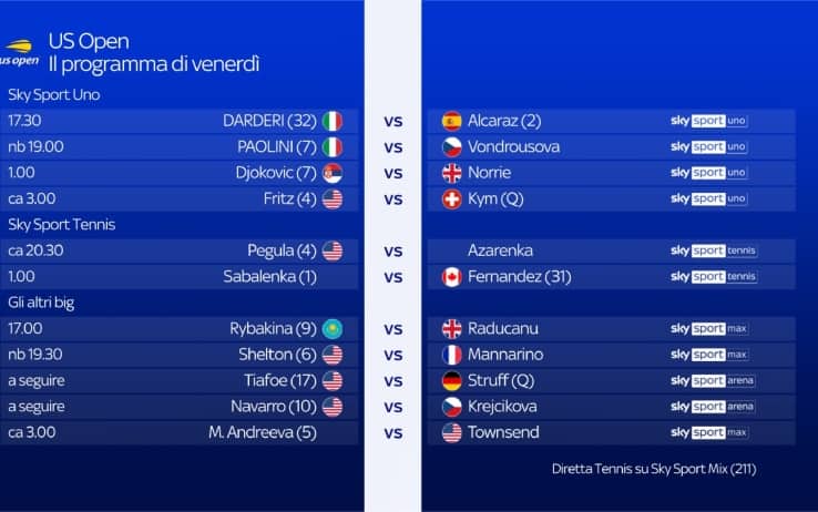 us openRiflettori puntati sull'Arthur Ashe per la sfida tra Carlos Alcaraz e Luciano Darderi. In campo anche Jasmine Paolini, contro la ceca Marketa Vondrousova. Il torneo è in diretta fino al 7 settembre su Sky Sport e in streaming su NOW
