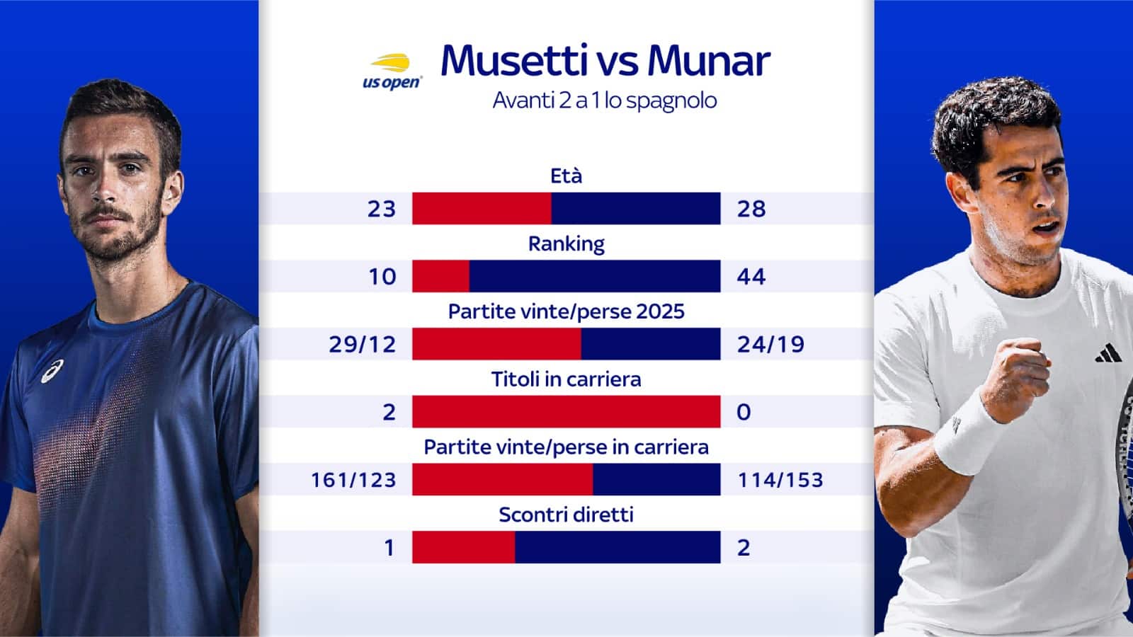 Lorenzo Musetti si prepara a giocare il suo primo ottavo di finale in carriera allo US Open. La testa di serie numero 10, dopo il successo nel derby azzurro contro Flavio Cobolli (che si è ritirato nel corso del terzo set), affronterà Jaume Munar (numero 44 al mondo). Lo spagnolo è reduce dalla netta vittoria contro il belga Bergs in tre set per 6-1, 6-4, 6-4. Il match, in programma lunedì 1 settembre come 3° incontro dalle 17, sarà in diretta su Sky Sport Uno, Sky Sport Tennis e in streaming su NOW.