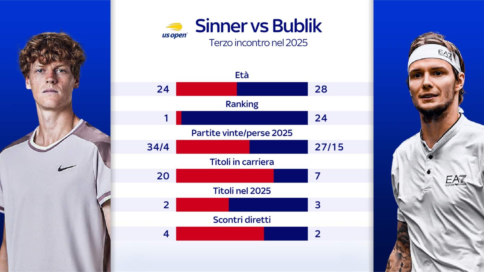 Tra i due sarà la terza sfida di questo 2025, la settima in totale. Sinner ha vinto il primo match giocato quest'anno al Roland Garros in tre set (6-1, 7-5, 6-0), mentre Bublik ha sconfitto il numero 1 al mondo al secondo turno di Halle nel mese di giugno. Jannik è avanti nei precedenti con 4 vittorie a 2.