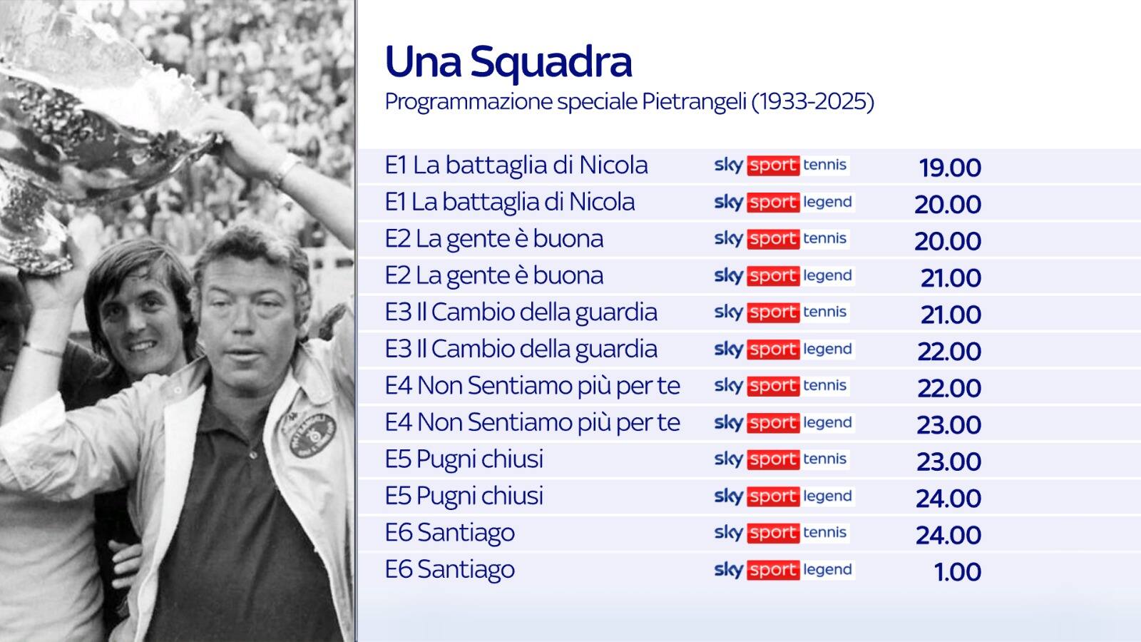 Sky, per ricordare Pietrangeli, scomparso oggi, dedica alla leggenda del tennis e dello sport una programmazione speciale, riproponendo, nella giornata di oggi gli speciali: ‘#SkyBuffaRacconta Davis ‘76-L’altro cammino di Santiago’ (due episodi) e 'Una Squadra', la docu-serie Sky Original in sei episodi che racconta la Coppa Davis vinta dall’Italia nel 1976 con Corrado Barazzutti, Paolo Bertolucci, Adriano Panatta, Tonino Zugarelli e il capitano Nicola Pietrangeli. Entrambi disponbili anche anche on demand.