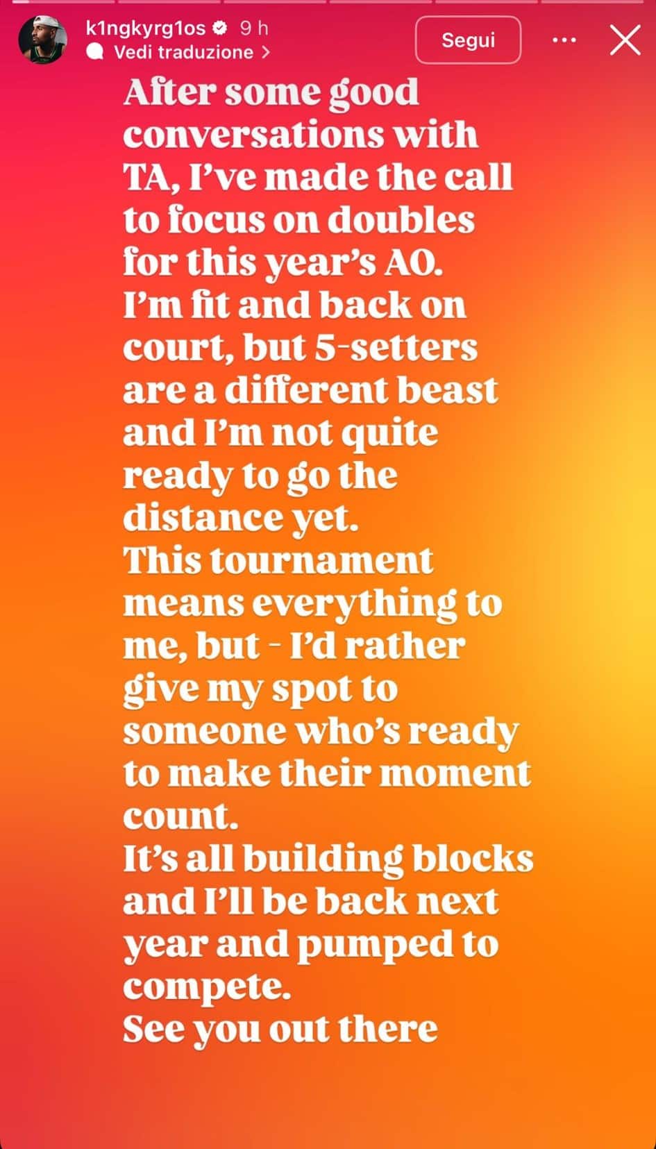 Con una storia pubblicata sui social, Nyck Kyrgios ha annunciato che non prenderà parte al singolare degli Australian Open (al via il prossimo 18 gennaio) e che si concentrerà solo sul torneo di doppio