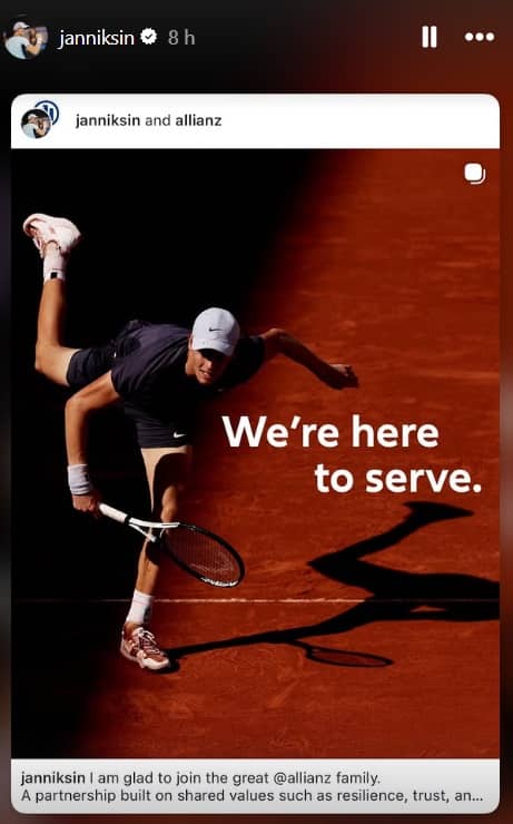 L’ultimo brand in ordine di tempo ad avvalersi della sua immagine è il Gruppo Allianz. Jannik è diventato “Global Brand Ambassador” del brand assicurativo di maggior valore al mondo, che si aggiunge a Lavazza (un grande legame fin da ragazzino, partnership recentemente rinnovata), Nike, Head, Gucci, Rolex, Explora Journeys, La Roche Posay e, in ambito più legato al territorio nazionale, Fastweb, Enervit e pasta De Cecco (l'azienda di Fara San Martino, 1260 abitanti in provincia di Chieti, Abruzzo, anche grazie alla risonanza che le offre il suo maggior testimonial, è sbarcata anche a Melbourne, con il brand esposto sul campo Centrale dell’Australian Open).