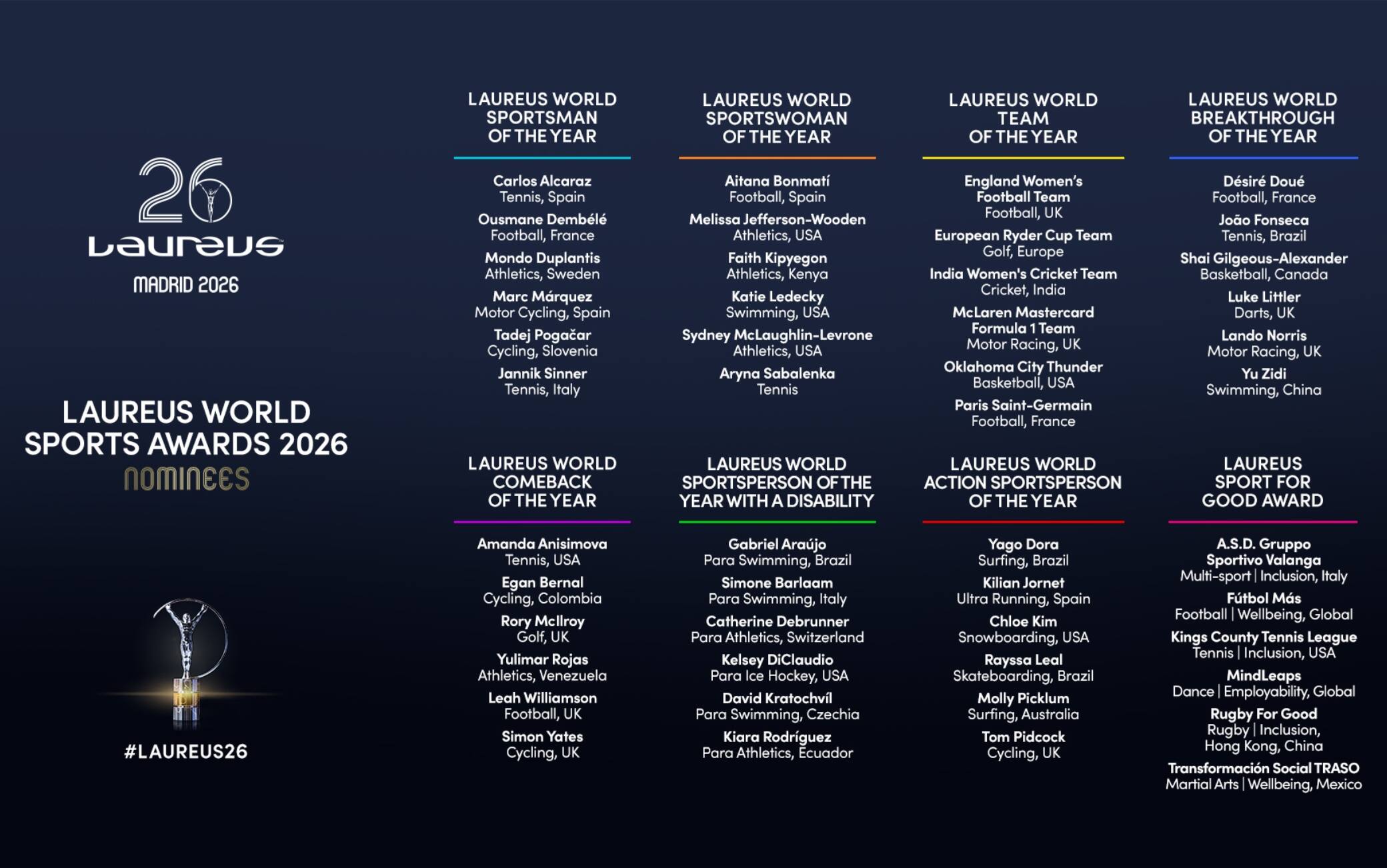 In nomination ai Laureus World Team of the Year ("Squadra dell’anno") gli Oklahoma City Thunder, che hanno vinto il primo titolo NBA nella storia della franchigia, eguagliando il totale di vittorie stagionali (84) dei Chicago Bulls del 1996/97. Con una schiacciante vittoria per 5-0 in finale sull'Inter, il Paris Saint-Germain ha conquistato la prima UEFA Champions League della sua storia. La squadra parigina ha chiuso il 2025 con sei titoli: al “triplete” nazionale si sono aggiunte la Supercoppa UEFA e la Coppa Intercontinentale FIFA. Nella semifinale della Coppa del Mondo di cricket contro l'Australia, la nazionale femminile indiana ha realizzato la più grande rimonta nella storia dell'ODI femminile (339), prima di vincere il suo primo titolo contro il Sudafrica, diventando la prima squadra femminile di cricket ad essere nominata per questo premio. La nazionale femminile di calcio inglese ha difeso il titolo europeo, sconfiggendo la Spagna ai rigori, mentre il team McLaren Mastercard di Formula 1 ha difeso il titolo mondiale costruttori con sei Gran Premi di anticipo. Il mezzo punto di Shane Lowry nell'ultima giornata ha permesso alla squadra europea della Ryder Cup di vincere, a New York, il suo sedicesimo titolo, ponendo fine a un digiuno di vittorie lontano dal Vecchio Continente che durava da 13 anni.Il premio Laureus World Comeback of the Year ("Ritorno dell’anno") celebra le straordinarie storie di sei atleti che hanno trionfato sulla scena mondiale nonostante le avversità. Nel 2025 Amanda Anisimova ha conquistato due titoli WTA 1000, a Doha e Pechino, e due finali del Grande Slam dopo che nel maggio 2023 aveva lasciato l’attività agonistica per dare priorità alla sua salute mentale. Una collisione con un autobus durante un allenamento in bicicletta nel 2022 avrebbe invece potuto costare la vita al colombiano Egan Bernal, capace nel 2025 di vincere il campionato nazionale a cronometro e in linea e la 16ª tappa della Vuelta a España. Rory McIlroy è rimasto per 11 lunghi anni senza vittorie nei tornei Major, ma ha concluso il suo periodo di magra in modo trionfale con il suo primo titolo ai Masters, conquistato grazie alla vittoria ai playoff contro Justin Rose. A causa di una lesione al tendine di achille sinistro, Yulimar Rojas non ha potuto participare alle Olimpiadi di Parigi 2024, ma, un anno dopo aver subito con successo l'intervento chirurgico, Rojas ha vinto, a Tokyo, la medaglia di bronzo nel salto triplo ai Campionati del mondo. Leah Williamson, da capitano, ha invece vinto lo scorso anno la UEFA Women’s Champions League con la maglia dell’Arsenal e il Campionato Europeo con quella della Nazionale inglese. Nel 2023 la calciatrice inglese era stata lontana dai campi di calcio per quasi 10 mesi in seguito alla rottura del legamento crociato anteriore del ginocchio. Nel 2025 Simon Yates ha vinto il Giro d’Italia con un attacco decisivo sul Cole delle Finestre nella penultima tappa, proprio dove era andato in crisi nell’edizione 2018 della Corsa Rosa, consegnando di fatto la vittoria finale a Chris Froome.