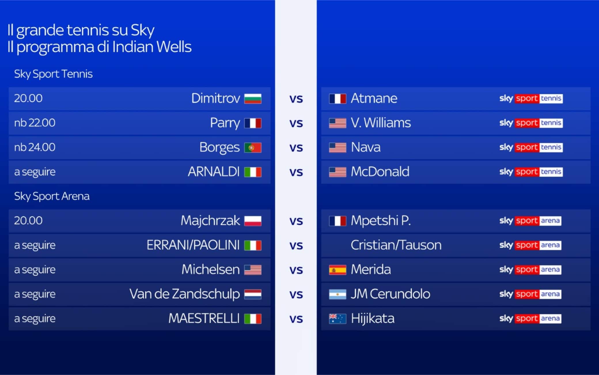 Secondo giorno al Masters 1000 di Indian Wells, tutto da seguire in diretta su Sky Sport e in streaming su NOW. Due gli italiani in campo: Matteo Arnaldi e Francesco Maestrelli. Il sanremese, pronto a tornare in campo dopo l'infortunio, affronterà nel suo secondo torneo del 2026 l'americano Mackenzie McDonald, numero 126 al mondo e proveniente dalle qualificazioni. Sarà la seconda sfida tra i due, con l'azzurro avanti 1-0 nei precedenti. Sarà anche la giornata del debutto nel main draw in un Masters 1000 per Francesco Maestrelli. Dopo un grande Australian Open (chiuso al secondo turno contro Djokovic), l'azzurro è entrato nel tabellone principale di Indian Wells battendo in due set Tirante nel turno decisivo delle qualificazioni. Sfiderà un altro qualificato, l'australiano Rinky Hijikata. Il vincitore di questo match se la vedrà contro Luciano Darderi, testa di serie numero 20. Nel doppio, invece, ci sono Jasmine Paolini e Sara Errani contro la coppia Cristian/Tauson.