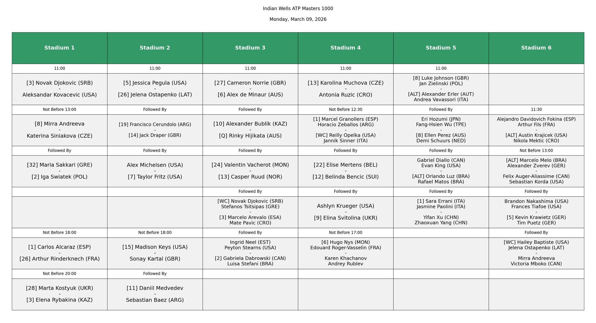atp indian wellsJannik Sinner protagonista questa sera non prima delle 20.30 in doppio con Opelka contro i n. 1 del seeding Granollers/Zeballos. Nel singolare riflettori su Carlos Alcaraz e Novak Djokovic: lo spagnolo affronterà il francese Rinderknech, il serbo opposto allo statunitense Kovacevic. Nel femminile ci sono Swiatek, Rybakina e Pegula. Tutto in diretta su Sky Sport e in streaming su NOW