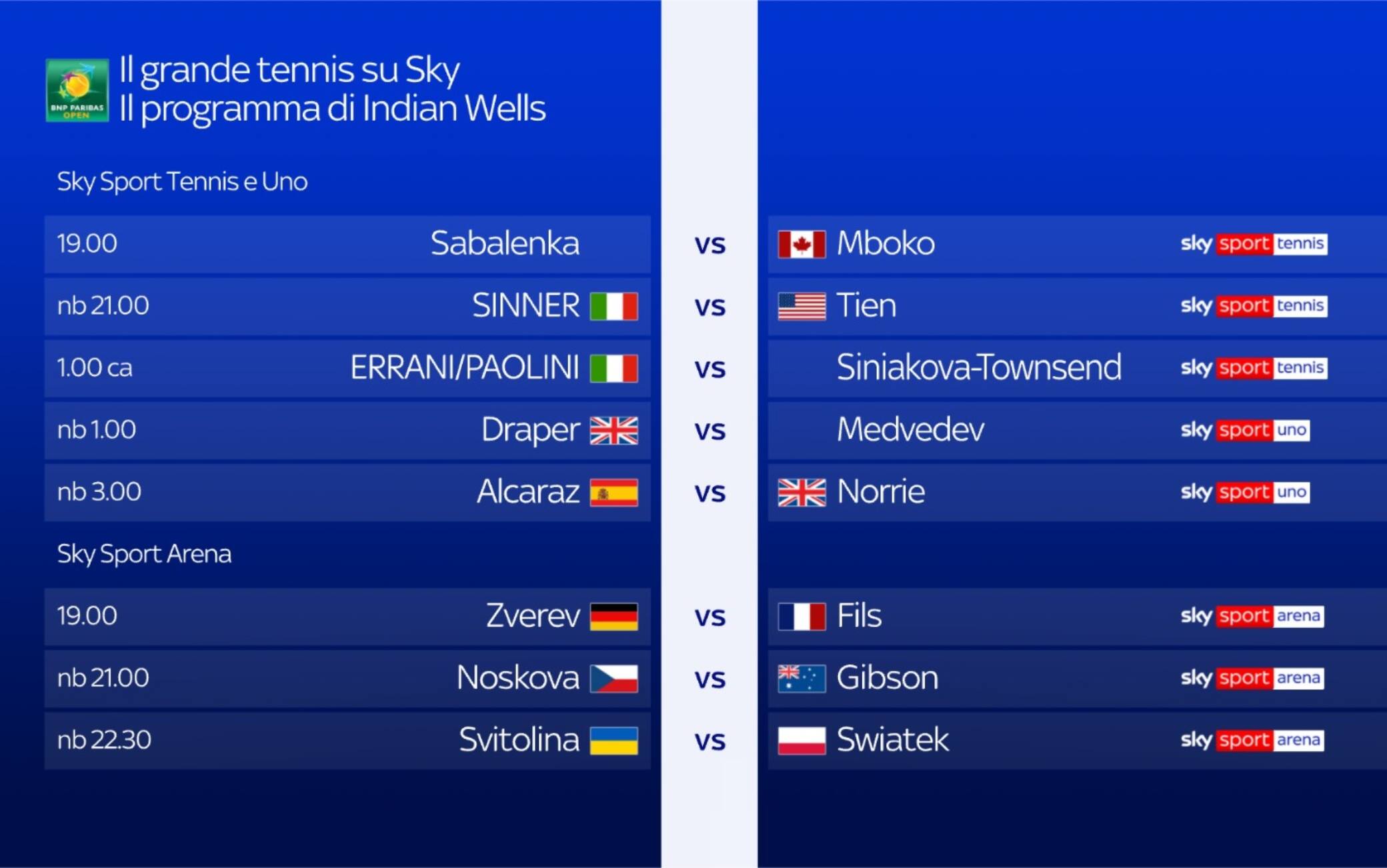 Nuova giornata di tennis da seguire in diretta su Sky Sport e in streaming su NOW. Al Masters 1000 di Indian Wells ci sono i quarti di finale. È il giorno del ritorno in campo di Jannik Sinner. Il numero due al mondo, che viene dalla vittoria contro Joao Fonseca agli ottavi, se la vedrà alle ore 21 contro l'americano Learner Tien (testa di serie numero 25). Sarà la seconda sfida tra i due, con Jannik che ha vinto l'unico precedente giocato lo scorso ottobre nella finale dell'Atp 500 di Pechino. Protagonista nella notte italiana Carlos Alcaraz. Il numero 1 al mondo affronterà Cameron Norrie per la nona volta a livello Atp, con i precedenti che vedono avanti lo spagnolo 5-3, anche se il britannico ha vinto l'ultimo incontro tra i due (al Masters 1000 di Parigi lo scorso ottobre). Dopo aver eliminato Novak Djokovic al tiebreak del terzo set, il campione in carica Jack Draper continua la difesa del titolo e sfiderà per un posto in semifinale il russo Daniil Medvedev. Il numero 4 al mondo Alexander Zverev, invece, giocherà contro il francese Arthur Fils. Nel doppio femminile, Sara Errani e Jasmine Paolini affrontano il duo Siniakova/Townsend.
