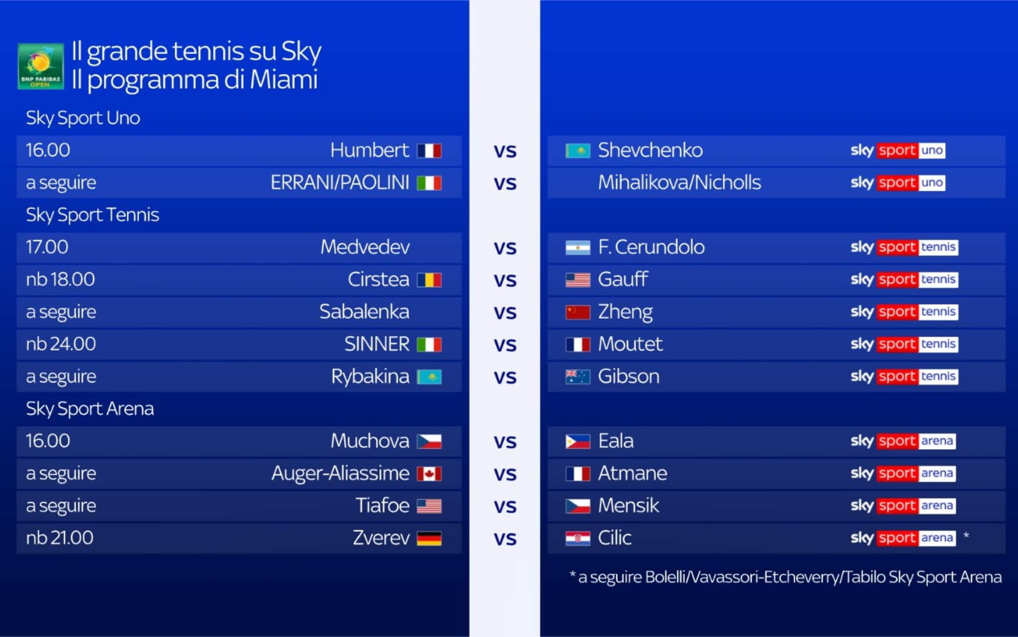 Proseguono i match del terzo turno al Masters 1000 di Miami dopo la clamorosa eliminazione di Alcaraz. Torna in campo Sinner non prima di mezzanotte, impegnato contro Moutet. Protagonisti anche Medvedev e Zverev contro l'argentino Cerundolo e il croato Cilic. Il torneo è in diretta su Sky Sport e in streaming su NOW