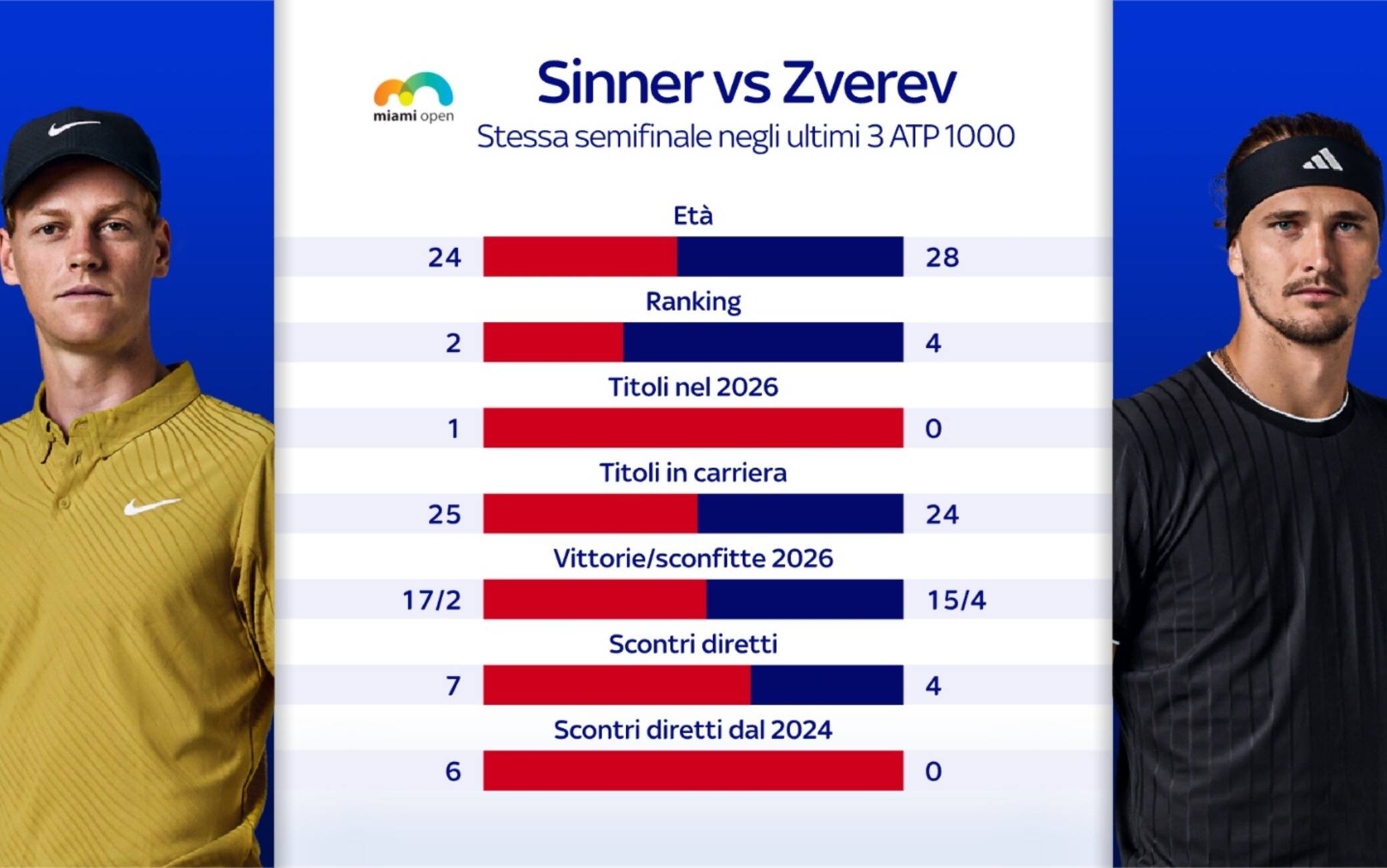 Il Miami Open entra nelle fasi cruciali, da seguire in diretta su Sky Sport e in streaming su NOW. Si giocano le semifinali del torneo maschile. Si apre alle 20 con la prima, inedita, che vedrà di fronte il ceco Lehecka e il francese Fils. A mezzanotte la seconda, un classico tra Sinner e Zverev, alla terza semifinale consecutiva in un Masters 1000 dopo Parigi 2025 e Indian Wells due settimane fa. Sarà un venerdì a forti tinte azzurre anche in doppio, con Errani/Paolini e Bolelli/Vavassori impegnati nelle rispettive semifinali contro Mertens/Zhang e Arends/Smith.