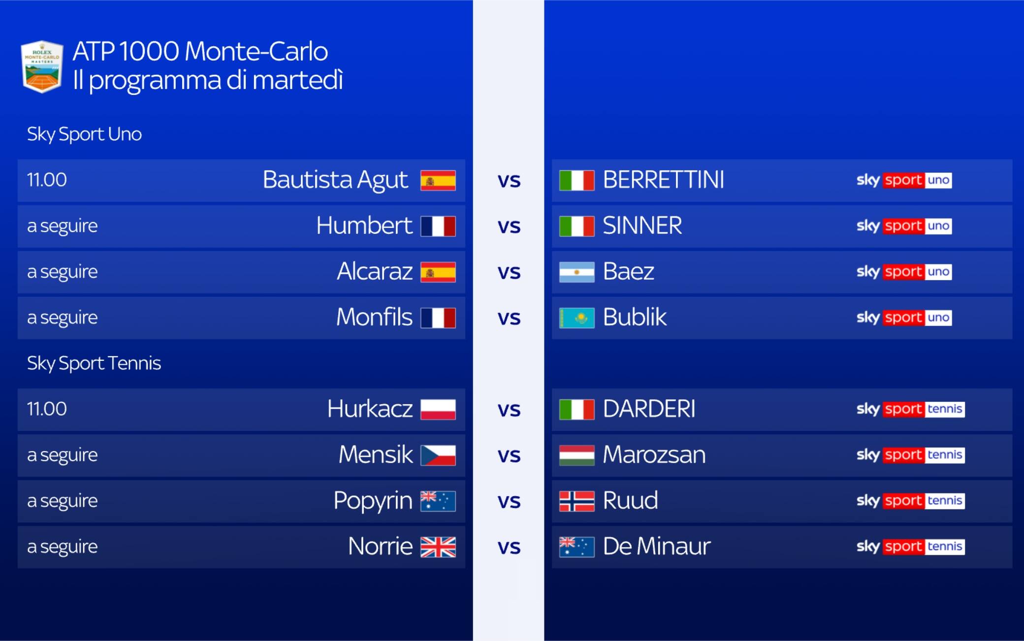 Sarà un super martedì da seguire tutto in diretta su Sky Sport e NOW. Ad aprire il programma sul Centrale sarà Matteo Berrettini che se la vedrà contro Bautista Agut. A seguire toccherà a Sinner-Humbert. Mentre dopo il match di Jannik, in campo il numero 1 al mondo Carlos Alcaraz.