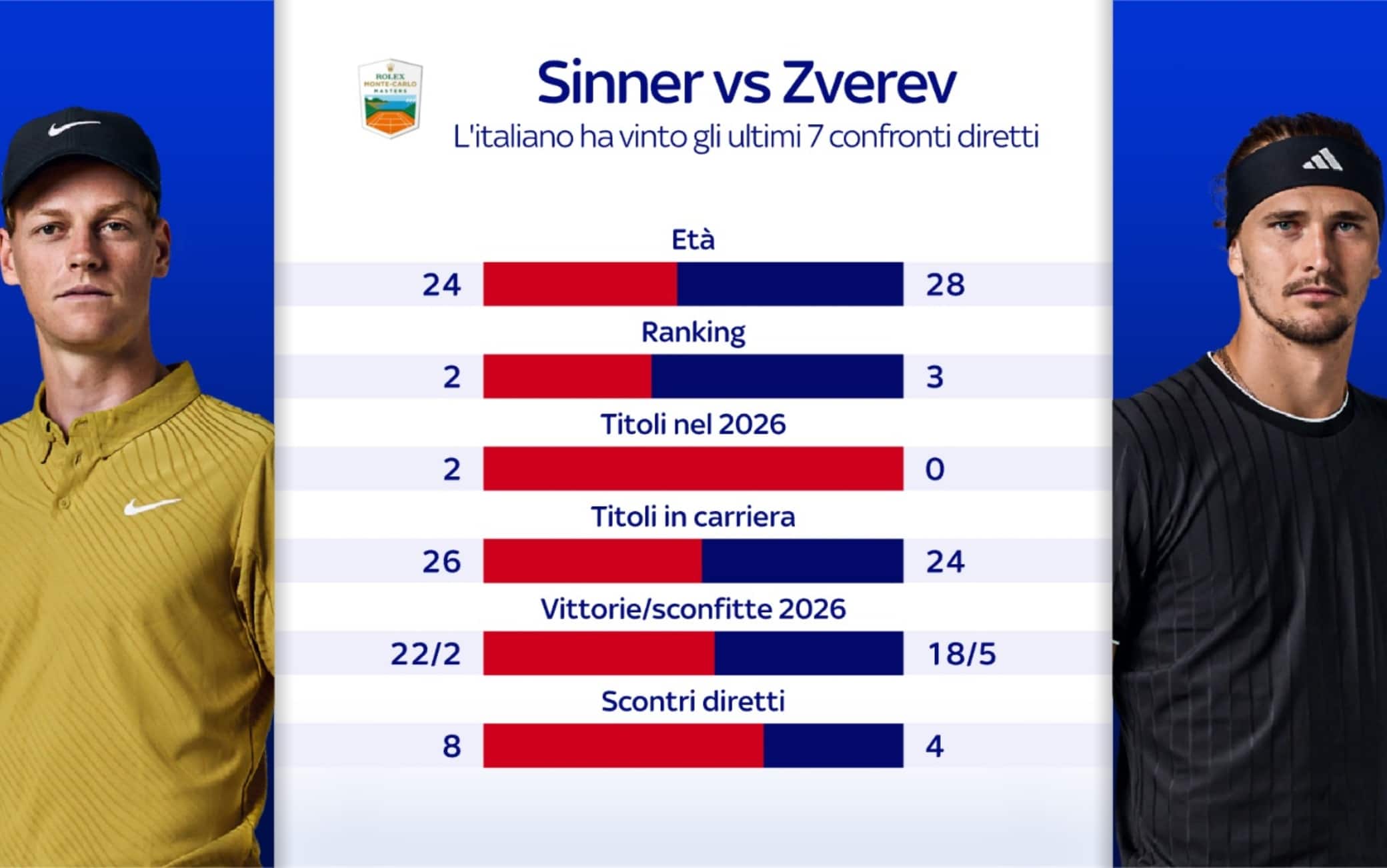 Sinner e Zverev torneranno ad affrontarsi sulla terra quattro anni dopo l'ultima volta. L'ultimo precedente sul rosso risale a Monte-Carlo 2022, quando nei quarti di finale il tedesco vinse in tre set. Il bilancio complessivo è 8-4 per Jannik che ha vinto le ultime sette sfide. Di seguito tutti i confronti: