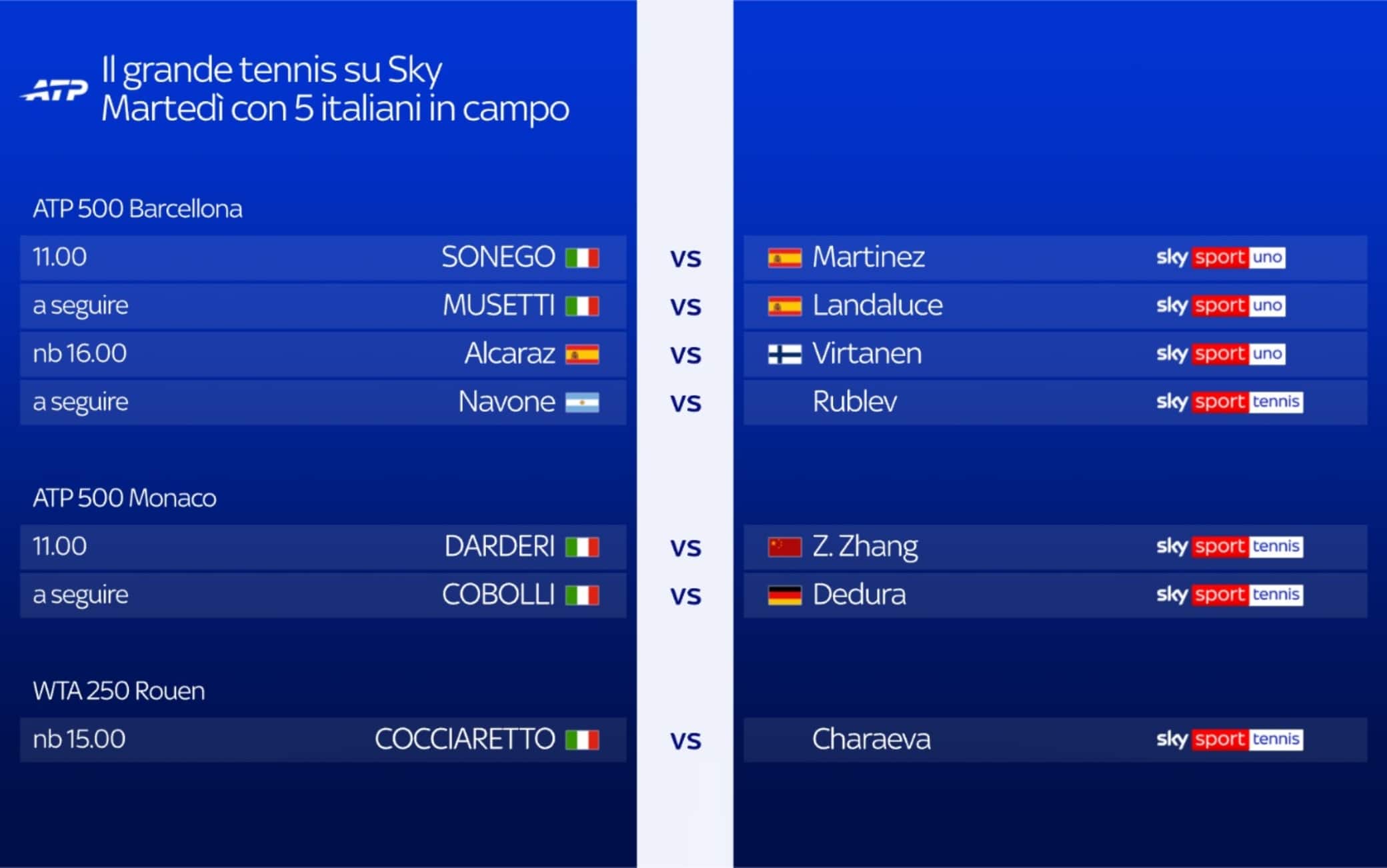 Sarà un super martedì di tennis da vivere in diretta su Sky Sport e in streaming su NOW. A Barcellona debuttano Alcaraz e Musetti, impegnati contro il finlandese Virtanen e lo spagnolo Landaluce. Spazio anche a Sonego contro l'iberico Martinez. A Monaco di Baviera esordio per Zverev, Cobolli e Darderi, mentre al Wta Rouen c'è Cocciaretto