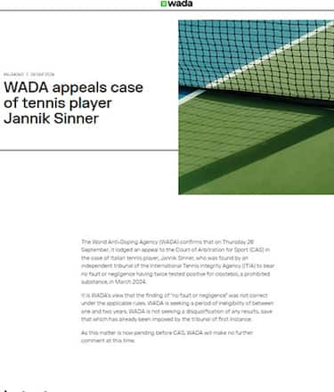 Il comunicato dell'Agenzia Mondiale Antidoping è arrivato mentre Sinner era in campo al China Open contro Safiullin. La Wada ha confermato di aver presentato ricorso alla Corte Arbitrale dello Sport (CAS) per il caso che coinvolge Jannik Sinner, giudicato senza colpa o negligenza dall'ITIA per essere risultato due volte positivo al clostebol a marzo 2024. In particolare, "la WADA ritiene che la constatazione di 'assenza di colpa o negligenza' non sia corretta ai sensi delle norme vigenti. La WADA chiede un periodo di ineleggibilità compreso tra uno e due anni. La WADA non chiede la squalifica di alcun risultato, salvo quella già inflitta dal tribunale di prima istanza".