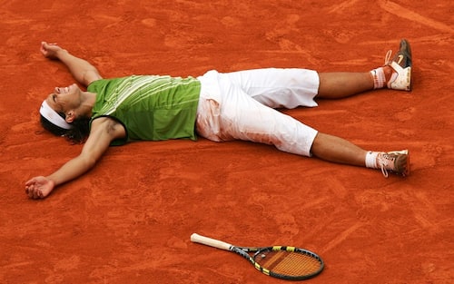 - A Parigi, il mondo scopre Rafa e i suoi riti. In sequenza: 1) Arrivo in campo e allineamento 'maniacale' delle bottigliette d'acqua; 2) Asciugamani minuziosamente collocati e ripiegati; 3) Prima del servizio: pulizia della riga con spazzata e tre colpi con la racchetta sotto la suola; sistemata a pantaloncini e slip ad altezza glutei. 4) Serie finale: su, la maglia sulle spalle sinistra-destra, tocco al naso, ordinata ai capelli sull'orecchio sinistro, ancora naso e capelli del destro. Polsino sulla fronte e sguardo all'avversario. Boom!