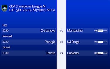 guida tvParte oggi anche la Champions League maschile di volley. Tre i club italiani al via: i campioni d'Europa in carica di Perugia, i campioni d'Italia di Trento e Civitanova, che aprirà la tre giorni ospitando i francesi del Montpellier. Tutte le partite live su Sky Sport Arena e NOW