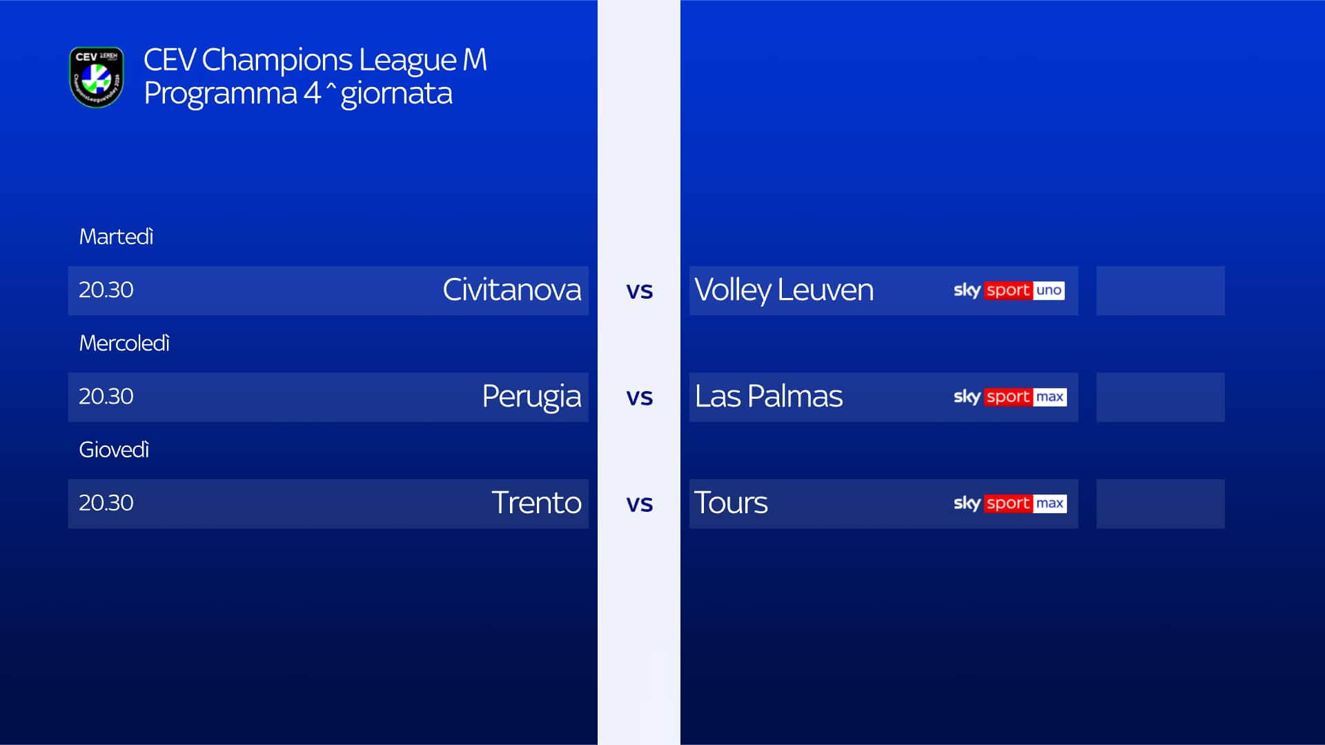 - Giovedì 29 gennaio alle 20.30 in diretta su Sky Sport Max e NOW: Trentino Itas-Tours VB (telecronaca di Rudy Palermo)