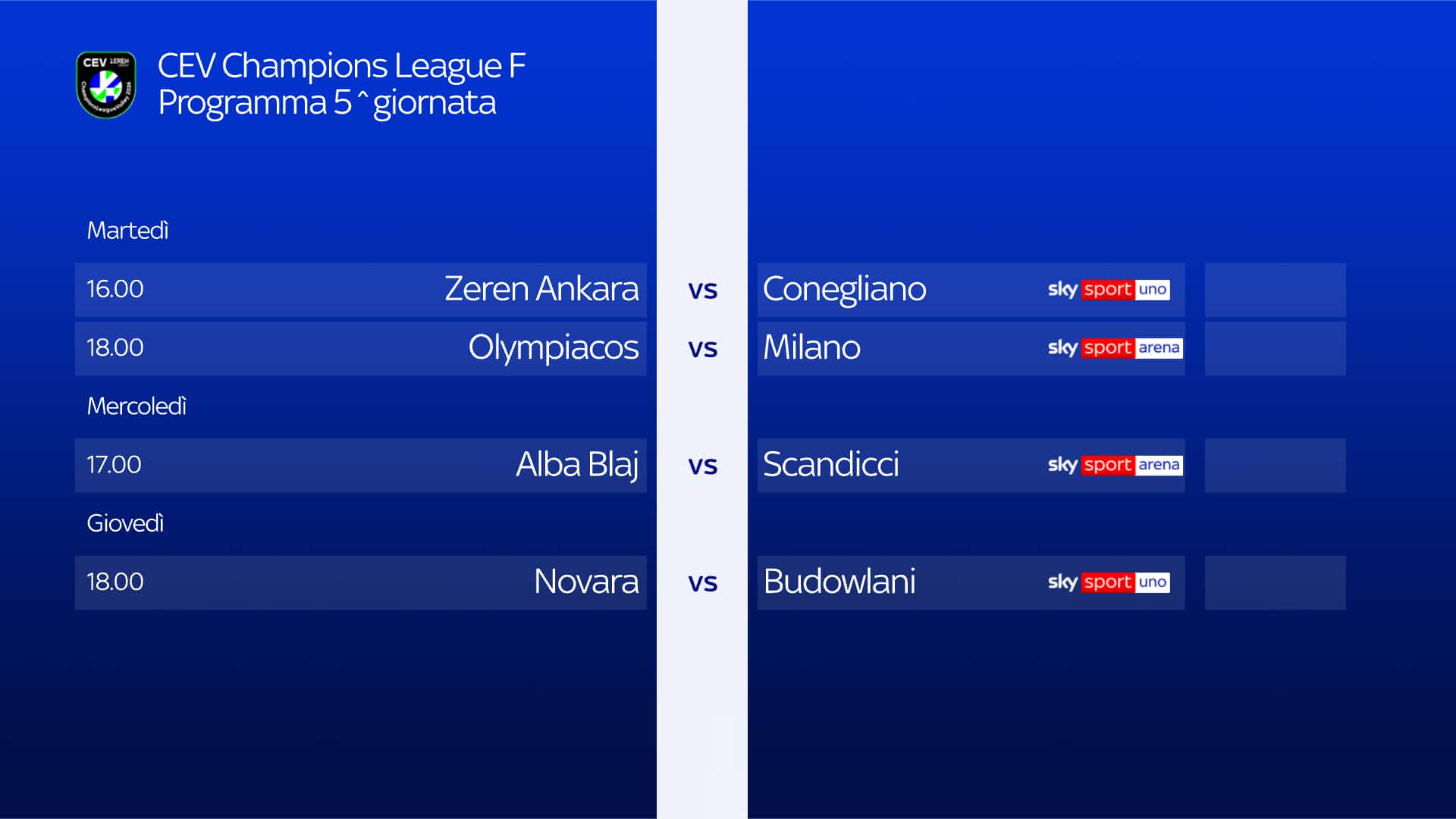 Per la CEV Champions Femminile in programma la 5^ giornata: martedì 27 gennaio apre Zeren Ankara-Conegliano, alle 16 su Sky Sport Uno, Sky Sport Max e NOW. Alle 18 Olympiacos-Milano, in diretta su Sky Sport Arena e NOW. Mercoledì 28 gennaio Scandicci è ospite dell’Alba Blaj alle 17 in diretta su Sky Sport Arena e NOW. Infine giovedì 29 gennaio Novara affronta Budowlani Lodz alle 18 su Sky Sport Uno, Sky Sport Max e NOW. Con risultati, classifiche, notizie e highlights, il grande volley europeo è protagonista anche su skysport.it, sulla APP Sky Sport e sui profili e account ufficiali di Sky Sport sui principali social network.